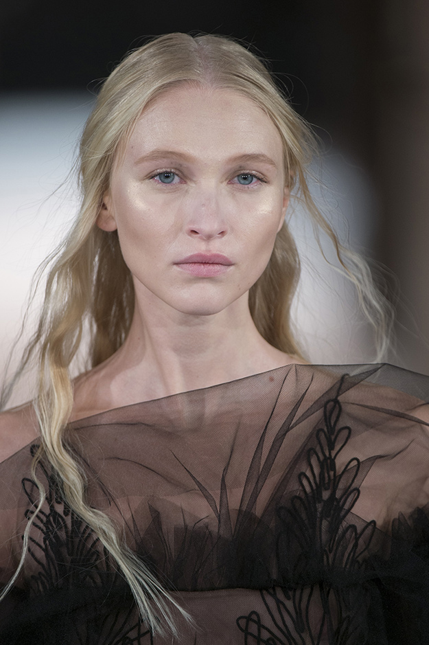 Прически и макияж: волна в прическе с пробором посередине, румяна и блестящий мейк