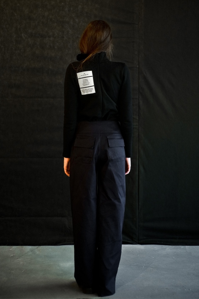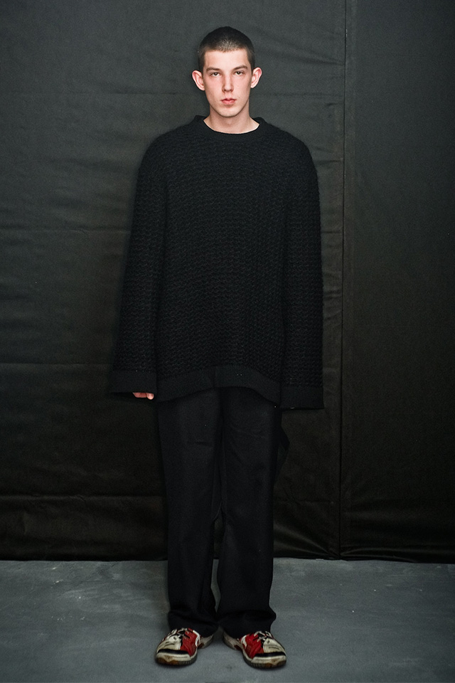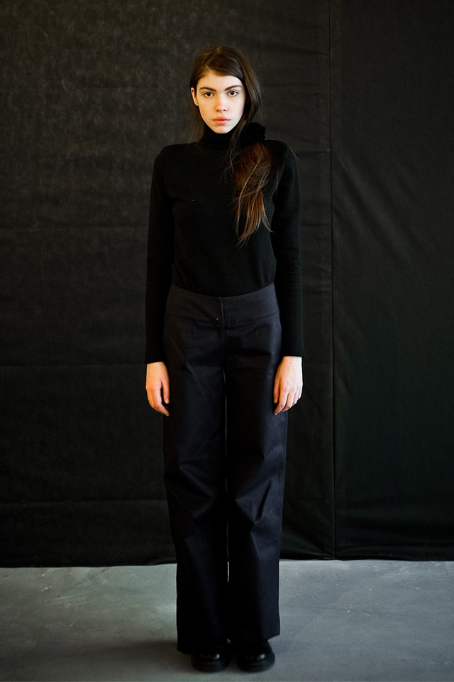 Коллекция, по словам Даши, вдохновлена рекламными каталогами рабочей одежды —и ее юношескими годами, проведенными в Петербурге, когда она была единственной девочкой в большой компании рэперов. Отсюда, похоже, пришли и силуэты oversize: огромные куртки, будто позаимствованные из отцовского гардероба, нарочито большие пиджаки и помятые юбки, словно неумело перешитые из старых мужских костюмов. Сочетает их Даша с вещами облегающими и узкими. Из-под куртки выглядывает край платья-водолазки, широкая рабочая рубашка надета поверх пушистого кроп-топа.