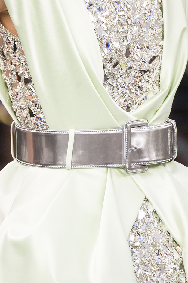Стайлинговые приемы: шляпки в тон костюмов, ботфорты в пайетках, продолжающие платье, широкие бедра и узкие талии, созданные при помощи крупных ремней, ткани нежных тонов, вышитые металлической нитью