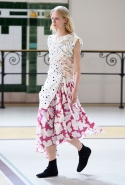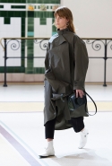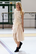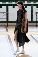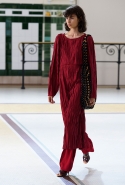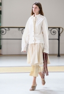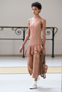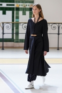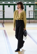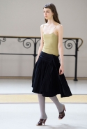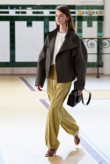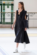Немного о фирменном стиле: Кристоф Лемер (и сам по себе, и в дуэте) всегда славился умением укутать женщину в пять метров ткани, но так, что во всем Париже было не сыскать более чувственного наряда. Тем удивительнее было увидеть в сегодняшнем шоу не привычные «глухие» блузы свободного кроя, изредка открывающие лишь ключицы, а диаметрально противоположные вещи —обтягивающие топы на тонких бретельках. Глубокое декольте в коллекции Lemaire последний раз появлялось в сезоне осень-зима 2015. Похоже, что спустя всего пару сезонов марка пересмотрела свои взгляды на сексуальность.