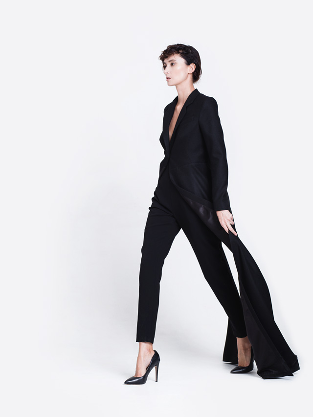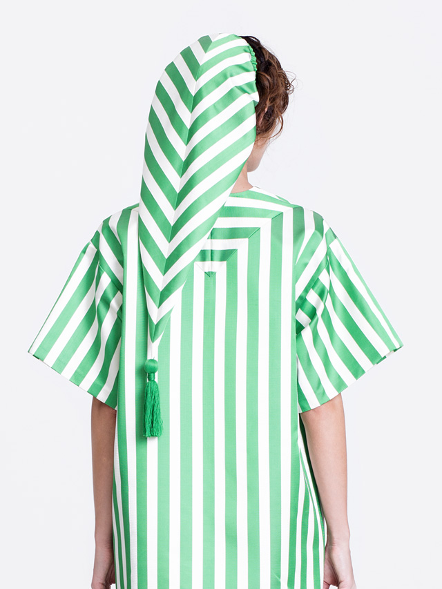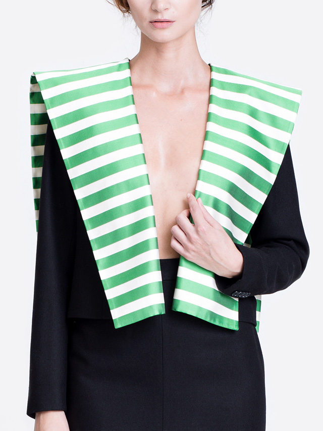 Название коллекции дано в честь знаменитого напитка, увековеченного в картинах художников начала прошлого века, стихах Артюра Рембо и романах Хемингуэя, — абсента. Кирилл Гасилин, как всегда, искусно смешивает несколько совершенно разных идей: в готовых образах нашли отражение и оп-арт, и элементы эпохи ар-деко, и галлюциногенные свойства абсента. Широкие полосы, приправленные зеленой жидкостью, складываются в гипнотизирующие геометрические узоры, а серебристые стрекозы и разноцветные звезды перелетают с одного платья на другое.