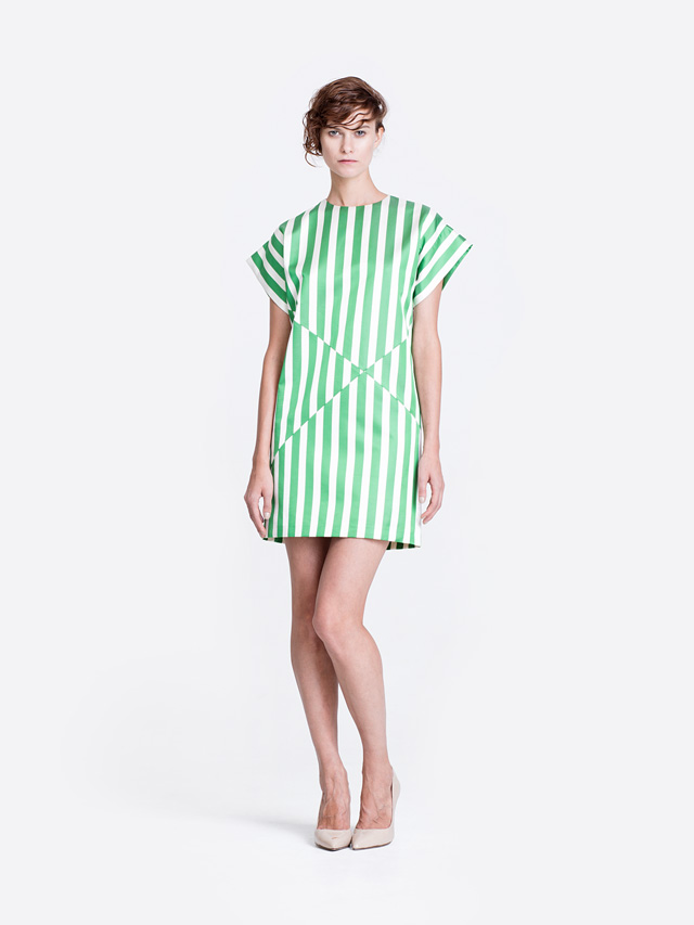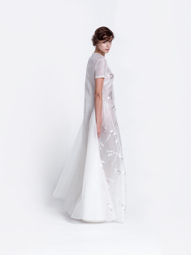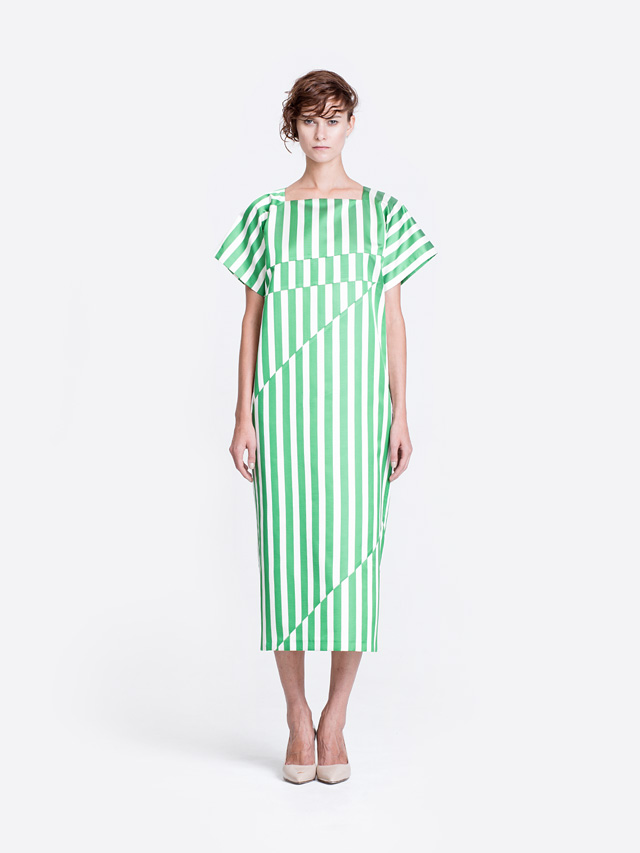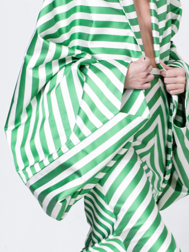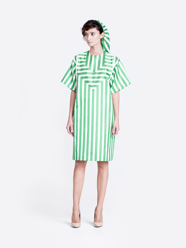 Знаменитый гасилинский крой, благодаря которому даже готовые вещи дизайнера идеально садятся по фигуре, остается одной из главных особенностей коллекции. За исключением нескольких, все минималистичны по силуэтам — прямые линии, чуть увеличенные в объеме "стоячие" рукава. Иронии сдержанным вещам добавляют наивные вышивки, выполненные двусторонней гладью и металлизированными нитями. А простоту полосатых жаккардовых платьев разрушают вставки из той же ткани, вшитые без точного соответствия общему узору — из-за них полоски "едут", общий рисунок искажается, превращая платья в оптические иллюзии.