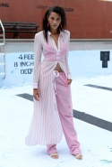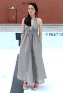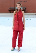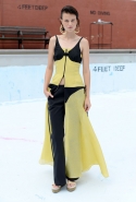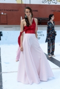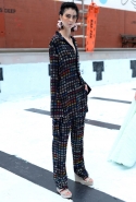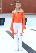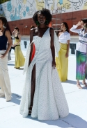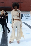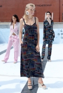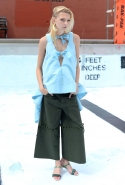 Рваные джинсы клеш и брюки-трубы, которые девушки Rosie Assoulin на этот раз носят с потрепанными яркими кофтами с широчайшими рукавами, огромные рабочие комбинезоны, костюмы-робы словно с чужого плеча — так и хочется одеть во что-то такое героинь сериала «Оранжевый — новый черный» в очередной журнальной съемке. При этом иногда эти брюки и топы срастаются с топами-бюстье. Те могут быть просто надеты поверх, а могут стать и частью просторной рубашки; могут быть тон в тон, а могут быть и контрастными. Ужасно эффектно это, например, выглядит в желто-черном выходе. При этом тут же, совсем рядом, стоят девушки почти в бальных пышных платьях, раскрашенных в конфетные тона, — настоящие принцессы.