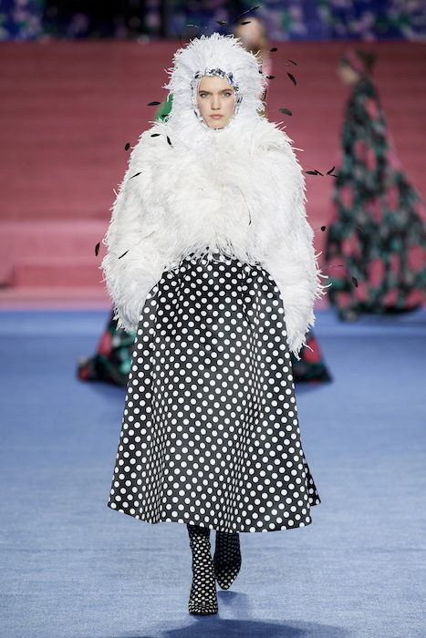 Показ британского дизайнера Ричарда Куинна открылся образами, с ног до головы расшитых жемчугом. Следующая партия платьев напоминала о дворцовых интерьерах — яркие цветы на черном бархате и задрапированые, как шторы, платья. В коллекцию также впервые вошли мужские комплекты — например, костюмы в сверкающую «гусиную лапку», топы в перьях или с вытканными розами: все это легко представить на красных дорожках.