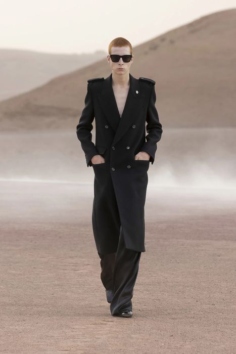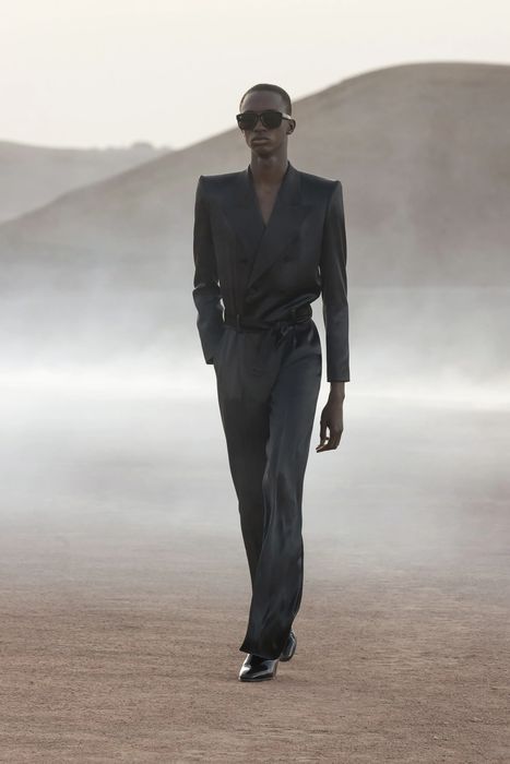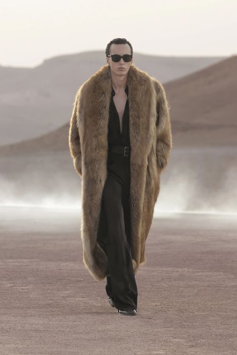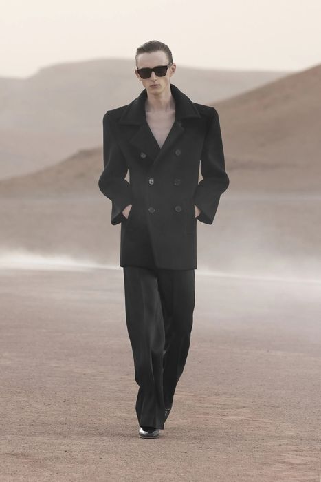 Показ новой мужской коллекции Saint Laurent прошел в пустыне Агафай, примерно в часе езды от Марракеша. Этот город любил Сен-Лоран, здесь, в саду Мажорель, находится его вилла. Декорации с огненным кольцом для шоу сделала художница Эс Девлин. Креативный директор Энтони Вакарелло говорит, что в коллекции оглядывался на собственный гардероб в 2000-х. Были пиджаки с заостренными плечами, кожаные плащи, двубортные укороченные пальто, кожаные плащи. Сен-лорановский дух передают смокинги, надетые на голое тело, расстегнутые до пояса шелковые рубашки, объемные шубы. Образы завершали остроносые мужские балетки, вьетнамки и лакированные ботинки на каблуке.