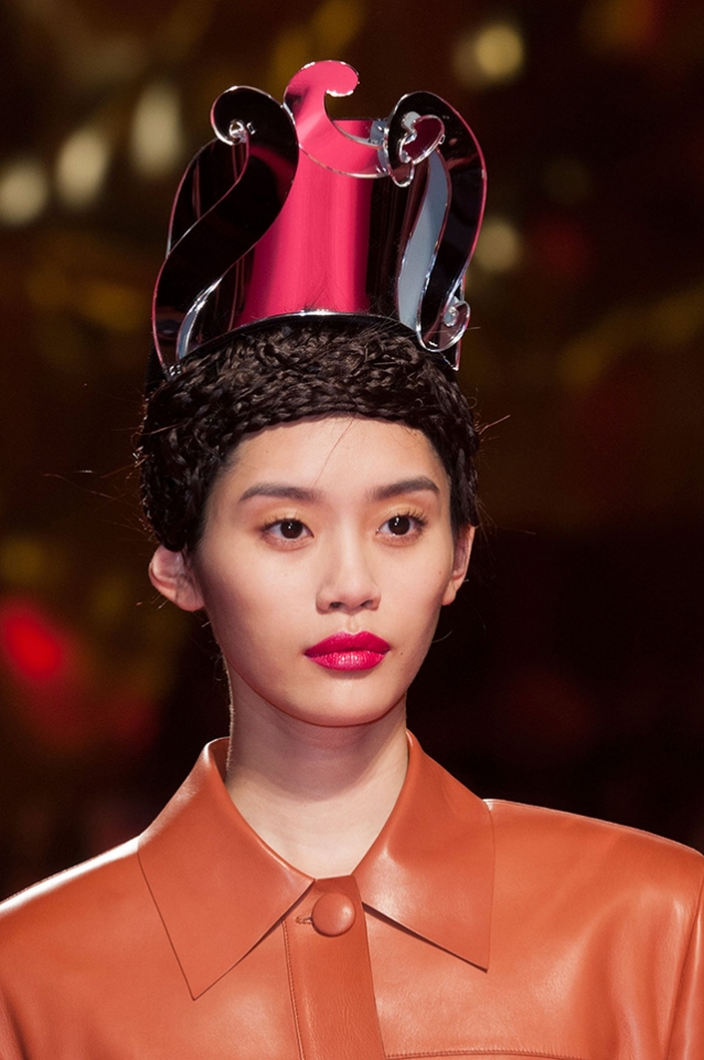 Такого же эффекта праздника коллекция, созданная совместными усилиями команды дома, не производит — но от этого не становится неудачной. Просто, несмотря на яркие краски и новую порцию сюрреалистичных принтов, она куда скромнее и спокойней, чем мы уже успели привыкнуть. Показателен в этом случае узор из цветных сердечек, "пришпиленных" к голубому платью булавками. В прошлый раз, на показе осенней коллекции, сердце тоже присутствовало на подиуме, но в десять раз больше, выложенное сияющими красными камнями на черном бархатном фоне. Все остальное вслед за маленькими пестрыми сердечками тоже резко уменьшилось в размере и успокоилось. Вместо смешного брючного костюма для невесты — молочный пижамный костюм на выход, вместо огромных буфов — вполне классические, за вычетом принтов, платья. Такой более скромный подход, впрочем, позволяет уделить больше внимания деталям, и тогда показ вдруг оказывается куда интересней: вместо привычного сумасшествия нам предлагают трогательное чудачество. С булавками, будто случайно "забытыми" в ткани платья, аппликацией в виде закрытого замка на кармашке или большим кожаным бантом, собранным из сердечек и прячущимся за спиной.