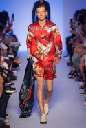 Вышивкам и принтам, а также шелковым костюмам-пижамам и прочим очевидным вещам вернуться все же придется: совсем не заговорить об этом было бы странно. Но никаких сюрпризов в этой японской части коллекции нет. Разве что к вышеупомянутым вышивкам-журавлям и цветочным принтам присоединяются еще и райские птицы с обезьянками в бамбуковых зарослях.