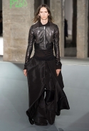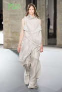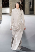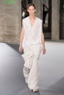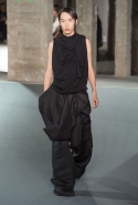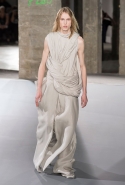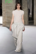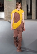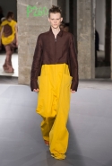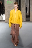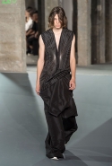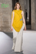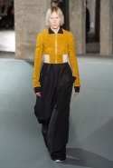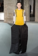 Довольно неожиданно для всех (и для нас) Рик Оуэнс решил изменить привычным неприметным и базовым тонам, добавив в коллекцию красок. Начиналось все со светло-серого, а продолжилось канареечно-желтым — он-то и стал в некотором роде главным героем коллекции, появляясь то тут, то там, и приводя за собой другие более свежие оттенки. В солнечный цвет окрасились и широкие-преширокие брюки (привет, Незнайка! А ведь не так давно этого же носовского персонажа мы вспоминали и после показа Hermes), и драпированные, к тому же скрученные узлами топы, и косухи (если не из привычной кожи, то из замши).