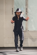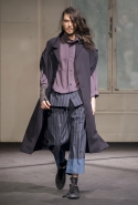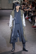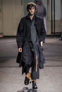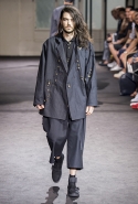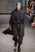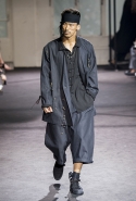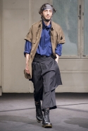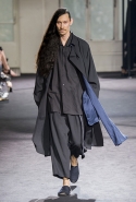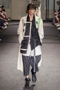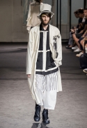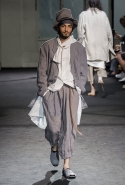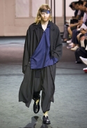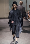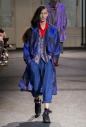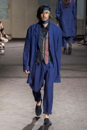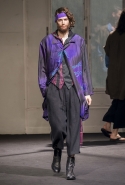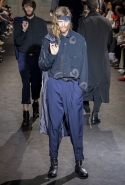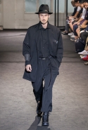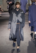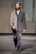 Так что своих моделей Ямамото наряжает странниками (в плащи-палатки, широкие брюки и мятые рубахи) и городскими безумцами (в фартуки, торчащие друг из-под друга рубашки, пижамы и разрисованные плащи). А стандартные брючные костюмы до подиума допускает только в разобранном виде: обливает их краской, беспощадно обрезает и кромсает, собирает новые вещи из кусков старых. А галстук и вовсе рисует прямо на рубашке — и зачеркивает жирной красной линией. Большая часть увиденного при этом выглядит вполне носимой и совсем не фриковой — даже в таком активном, насыщенном стайлинге.