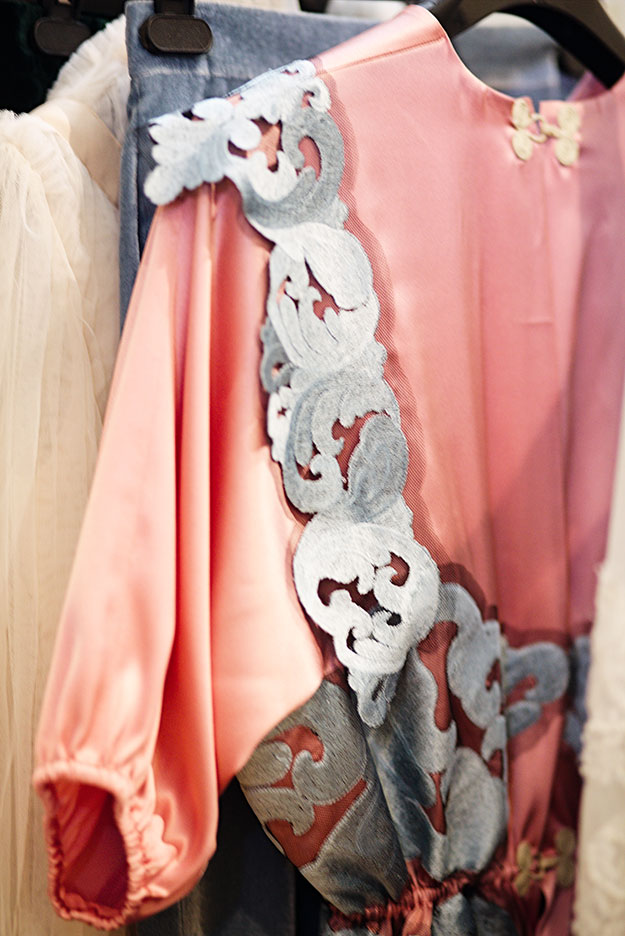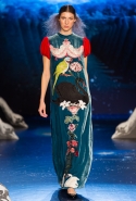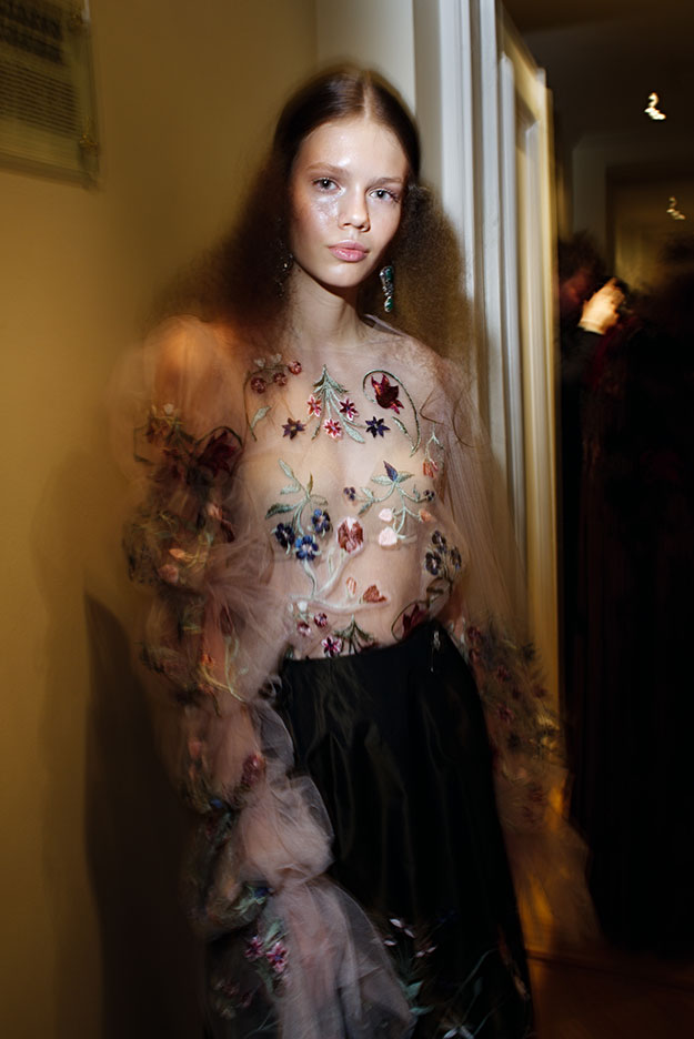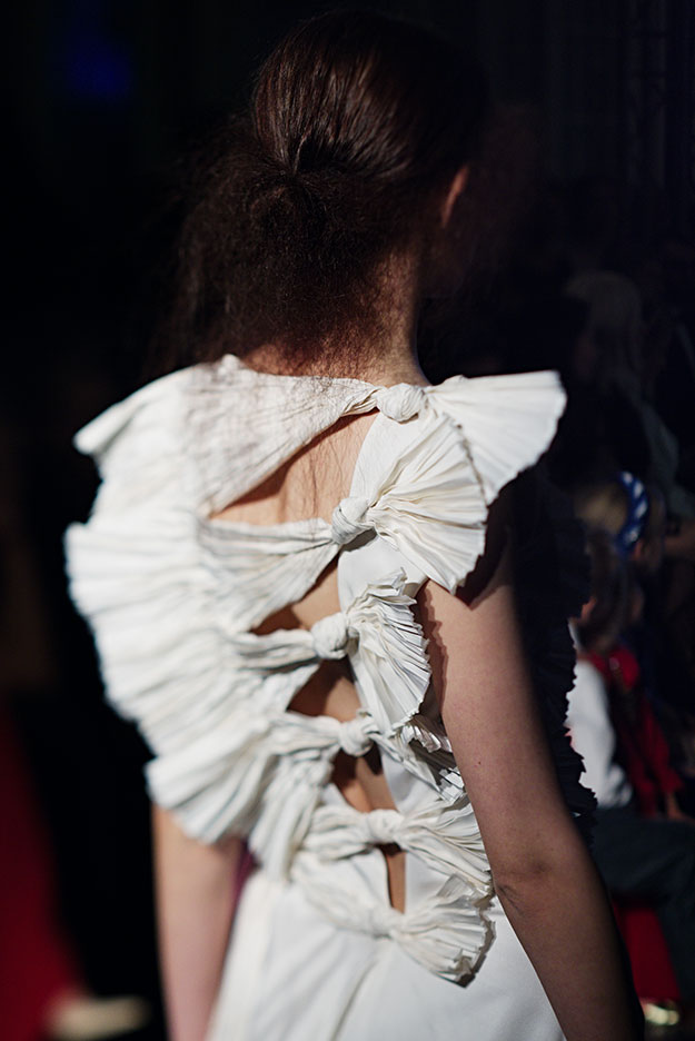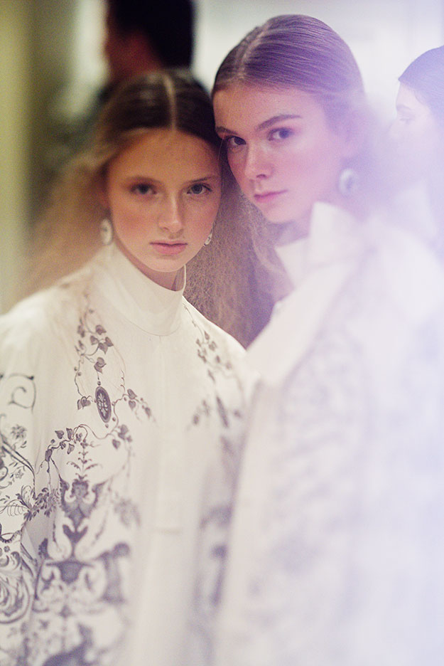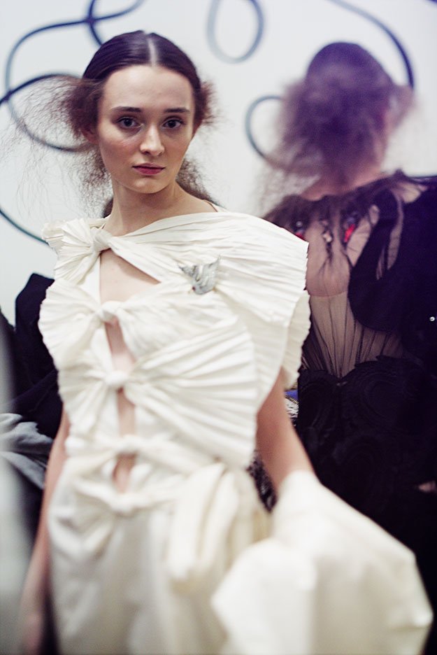Приемы и текстуры самые разные: орнаменты и фигурная стежка, россыпь стекляруса, перламутровый бархат, вышивка по белоснежному хлопку, узлы бантов на платьях из шелковой тафты, воздушные летящие или асимметрично ниспадающие к полу рукава, мотивы эпохи Возрождения и раннего барокко.