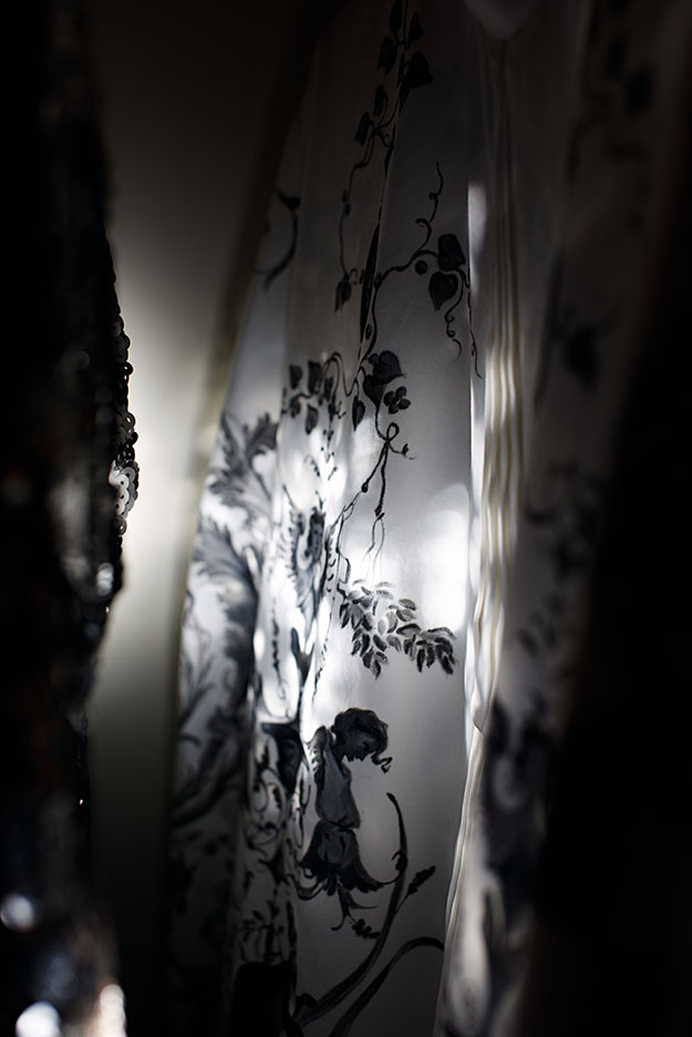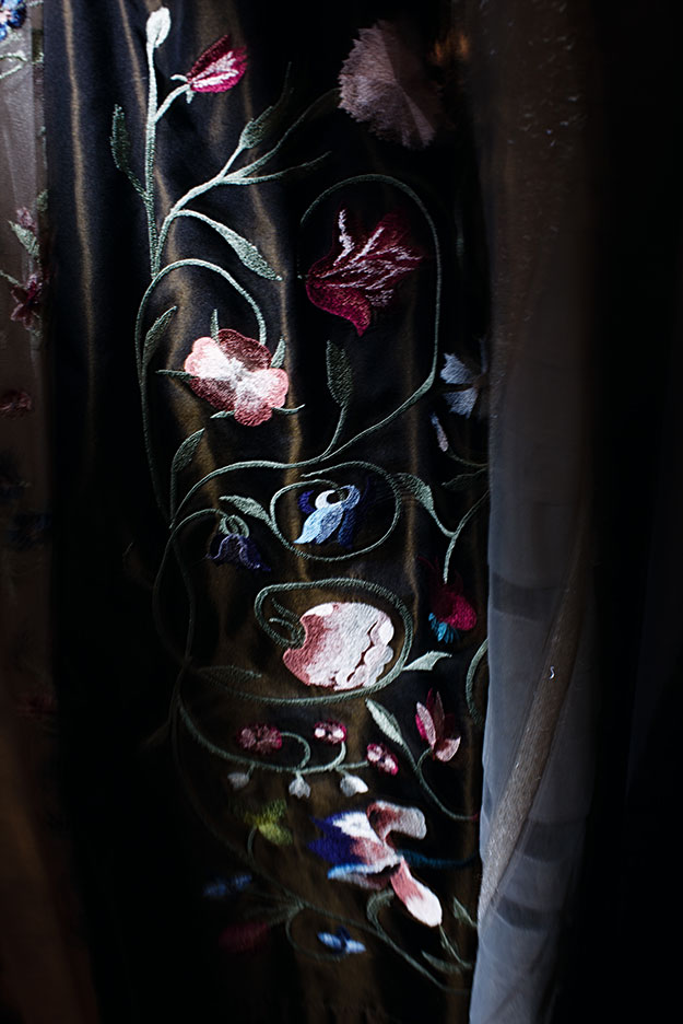 Новая коллекция не стала исключением: каждый созданный гладью стебель арабесок и лилий затем расшивался стеклярусом не один день.