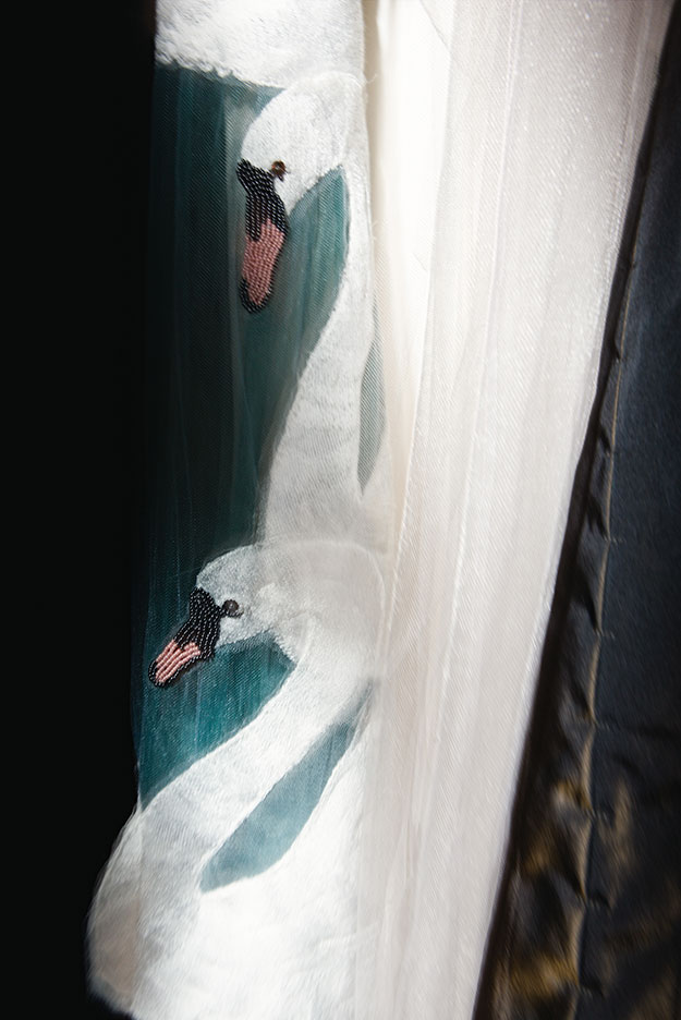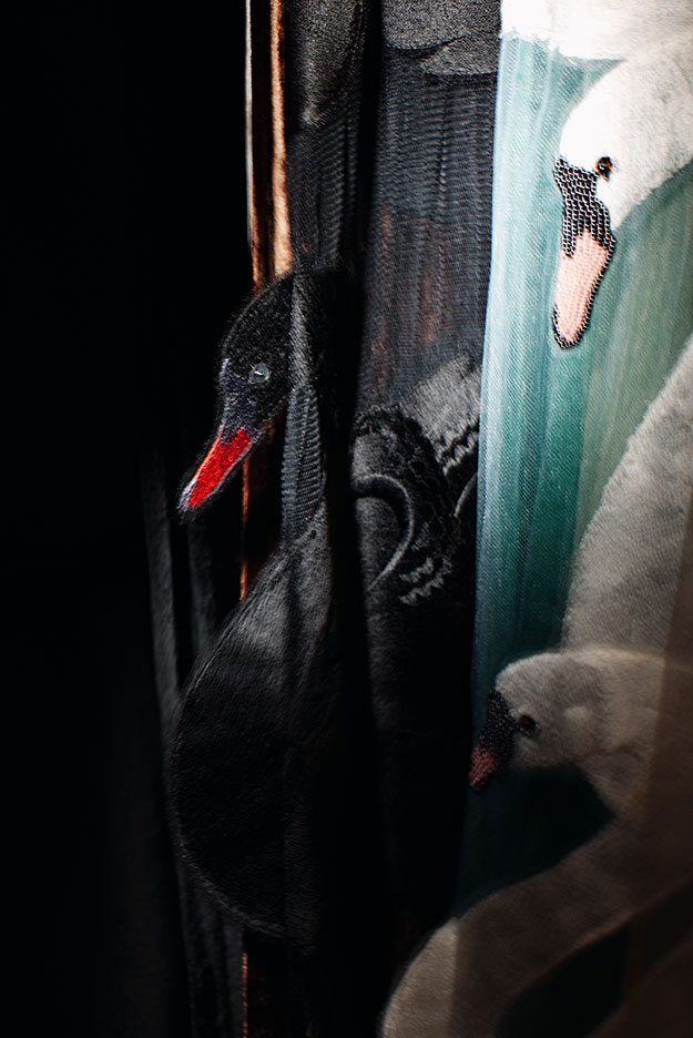 «Истории лебедя» со сложными вышивками и аппликациями на тему флоры и фауны