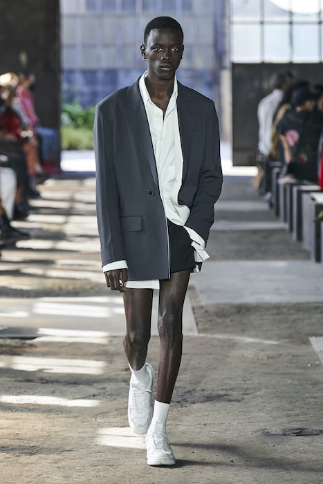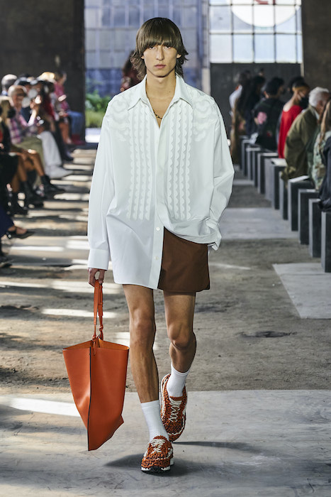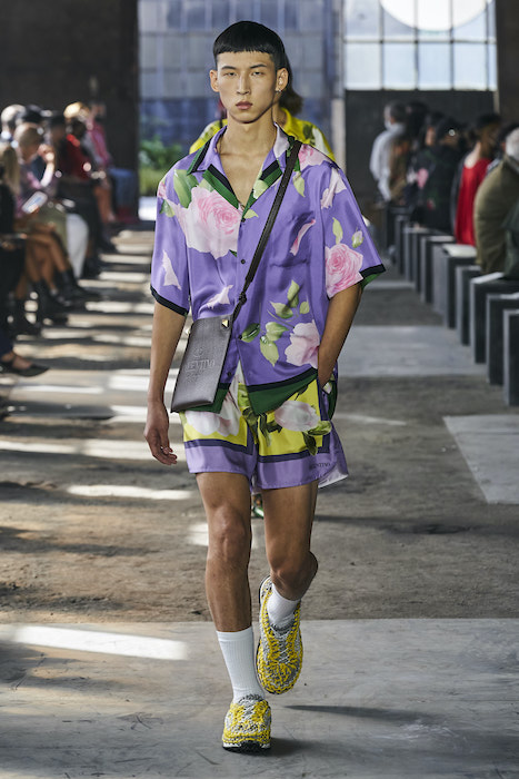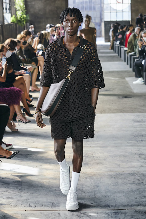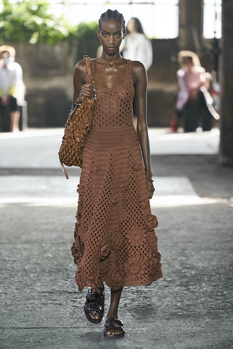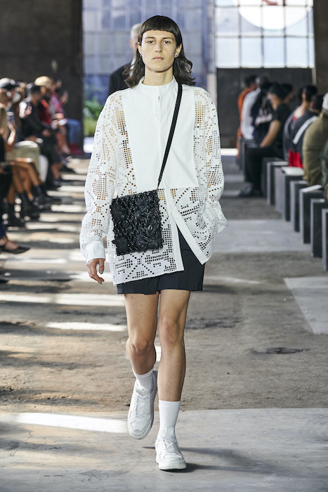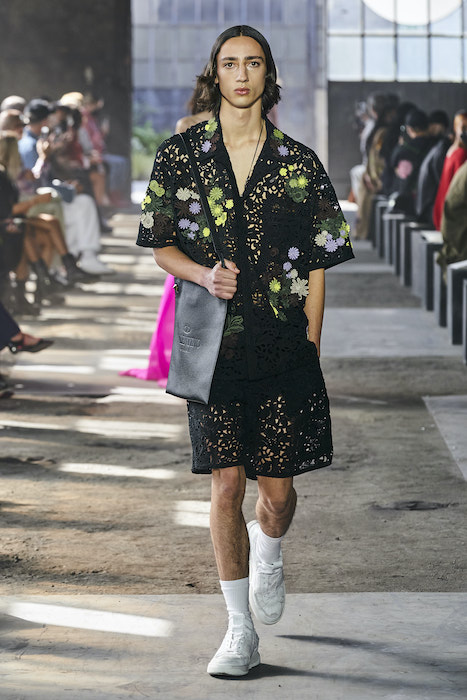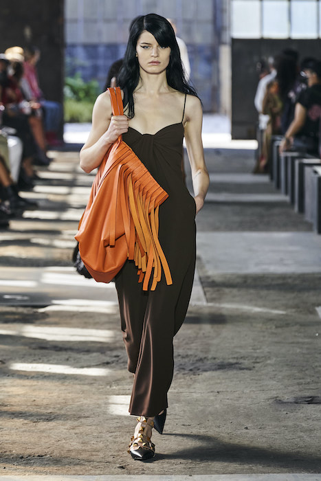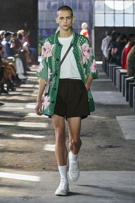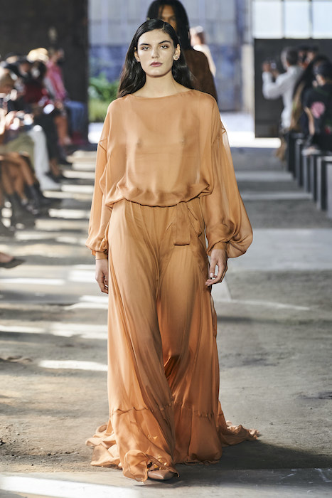 Образы в коллекции можно условно поделить на две части — мини и макси. В первой — платья-футляры чистых силуэтов и короткие шорты, которые носят то с мужскими рубашками, то с кружевными блузками, то с простыми трикотажными топами (один из таких аскетичных образов и открыл показ). Вторая часть коллекции — это платья-кейпы с бахромой на месте рукавов и уютные платья-халаты с цветочным принтом. Палитра коллекции варьируются от оттенков, сливающихся с кожей, до ярких вспышек желтого, зеленого и сиреневого.