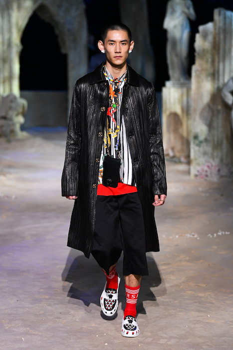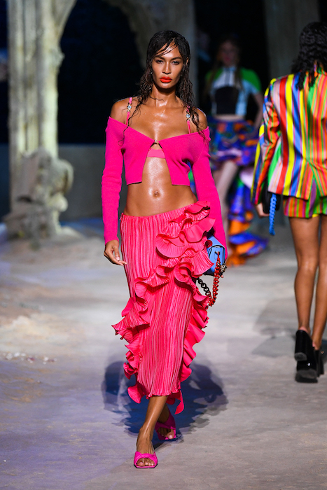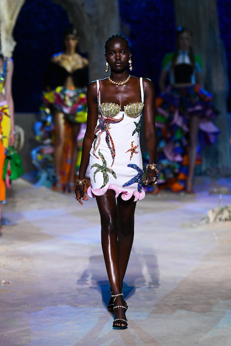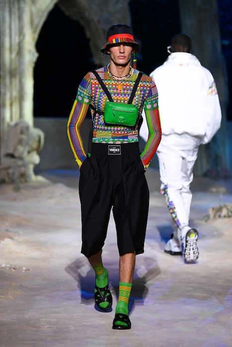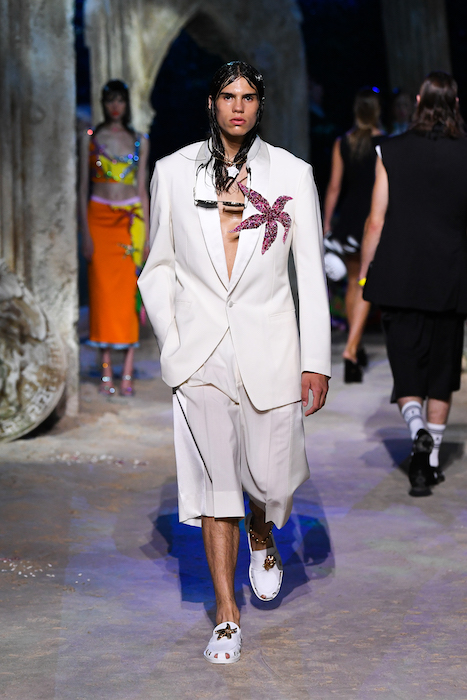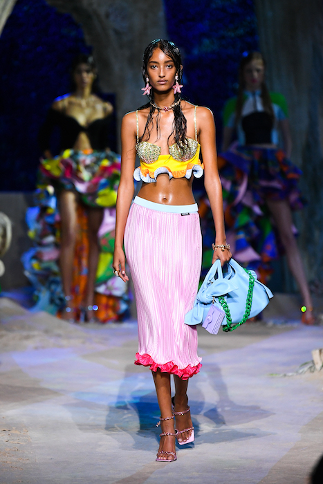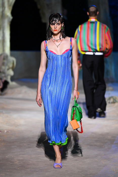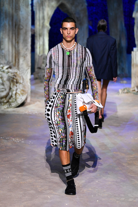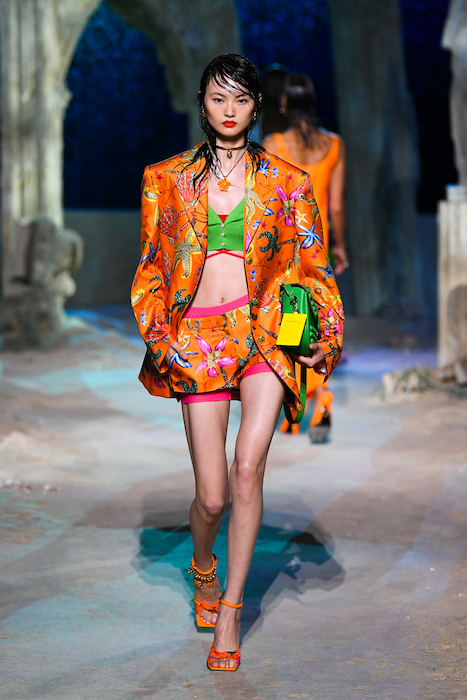 Новая коллекция Донателлы Версаче получила название Versacepolis и отсылает к самому узнаваемому принту бренда — Trésor de la Mer. Орнамент с морскими звездами оживлен яркими оттенками: он расстилается на оранжевых юбках, желтых топах, ярко-зеленых рубашках из мужской линии. Морскую тематику продолжают летние панамки, короткие топы, мужские рубашки с распахнутыми воротниками и пляжные шорты. В производстве последних, к слову, использованы переработанные полиэстер и полиамид. Важная премьера сезона для Versace – линейка сумок La Medusa, которая получила свое название в честь Медузы Горгоны, символа модного дома. Сумки выпущены в множестве ярких цветов, но внутри все они сделаны в сиреневом цвете.