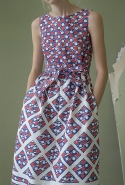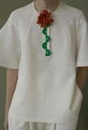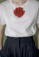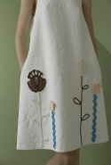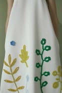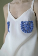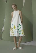 Сильнее всего в этом убеждает, конечно, то, как Газинская использует цветочные и растительные мотивы. Вместо того чтобы, руководствуясь вечным законом «цветы — для весны», покрыть все бутонами и лепестками, она пускает их только по подолу платьев. Примерно так рисуют окружающий мир дети, которые берут в руки краски. Снизу — широкая полоса, изображающая землю, из нее поднимаются полосы поуже, иногда с торчащими в стороны палками-листьями, венчающиеся красными и желтыми пятнами, — это, понятное дело, стебли с бутонами. Конечно, дизайнер те же ветки, как будто нарисованные детской рукой (в нашем случае вывязанные — как ажурные салфетки у бабушки на столе), потом использует и иначе. Рассыпает, как экспонаты гербария, по топам или сажает на воротник, чтобы красный бутон на длинном стебельке распускался прямо у горла.
