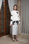 Главной заменой прошлогодним журавлям стали крупные графичные цветы, либо вшитые в вещи, либо нарочито небрежно нашитые поверх — максимально отличающиеся от основной ткани по фактуре и цвету. А вторым акцентом оказались ленты с кисточками из бисера и стекляруса, которые используются и как пояса на юбках, и как просто детали декора, не несущие никакой практической функции. Их Женя Ким, например, нашивает на спины просторных рубах — выглядит это совершенно нелогично, но очень красиво.