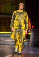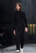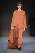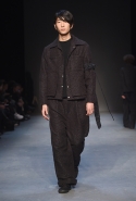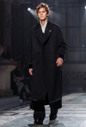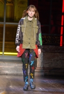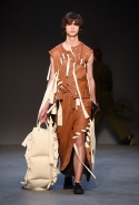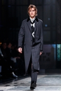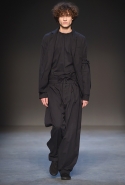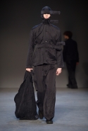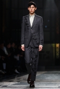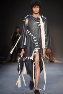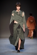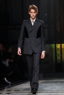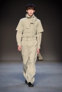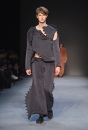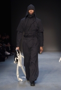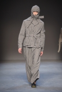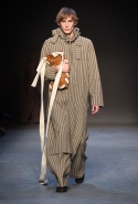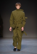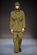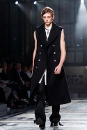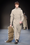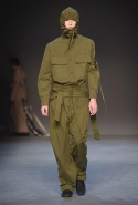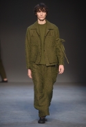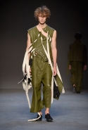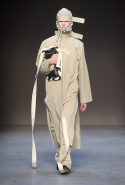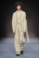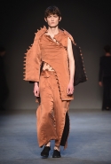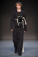 Концептуалист Крейг Грин вновь показал очень чувственную коллекцию — и этому ощущению нисколько не мешает тот факт, что модели на его показе были опять укутаны тканью с головы до ног. Тем более тканями не тонкими и летящими, а наоборот — фактурными и «приземленными», в соответствующих оттенках — от коричневого до хаки. Так что некоторые наряды упорно напоминают то военную форму, когда составлены из курток, брюк и комбинезонов, то больничные одежды, когда упор делается на те же комбинезоны, но в полоску, еще и изрезанные поверх ремнями, и бесформенные робы. Но чувственность прорывается тогда, когда Грин вспоминает о своем любимом приеме, и сквозь эти массивы ткани проглядывает обнаженное тело. Раньше это были круги на месте солнечного сплетения, ставшие настоящим символом беззащитности, теперь — прорези, разрывы и расходящиеся видимые швы.