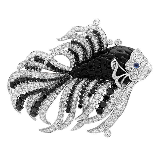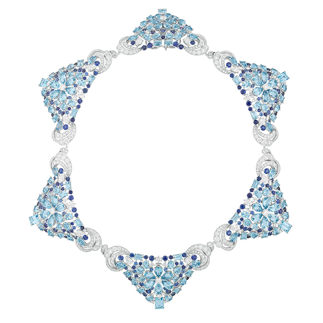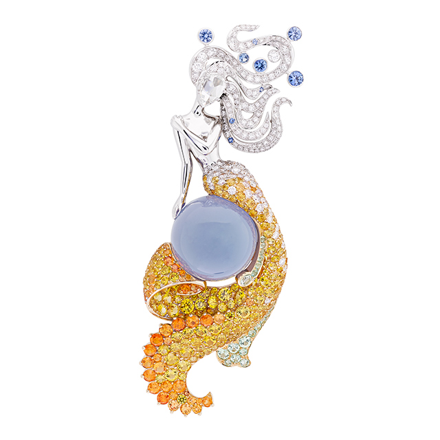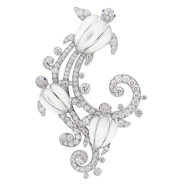 Черепахи (один из любимых образов Van Cleef & Arpels), русалки и морские звезды оживают в ювелирном воплощении, бирюза и прозрачные изумруды напоминают о красоте побережий. Причудливая игра цветов предстает в водной палитре драгоценных камней Pierres de Caractère: фантазия ведет мастеров дома от Средиземного моря к Адриатическому и Аравийскому, от Красного, Каспийского и Черного к Атлантическому и Индийскому океанам. Это дальнее плавание демонстрирует все цветовые нюансы морской воды: от многочисленных оттенков бирюзового до изумрудно-зеленых, оживающих в отблесках полуденного солнца и мерцающих при лунном свете.