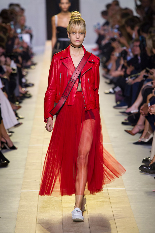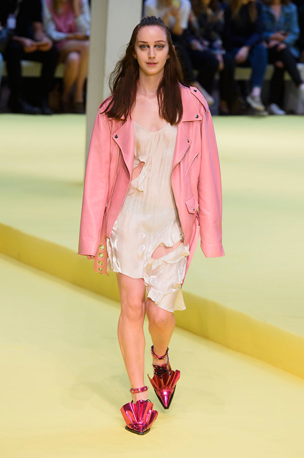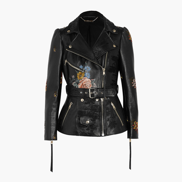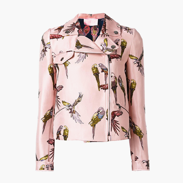 Косуха с вкраплениями цвета или полностью цветная подойдет тем, кому не слишком импонирует тяжелая рокерская эстетика. Этой весной Мария Грация Кьюри, например, предлагает выделяться из толпы при помощи косухи в сочном красном цвете. Более нежный вариант, конфетного розового цвета, появился на показе Marques Almeida. Однако самый компромиссный и интересный вариант показали на весенне-летнем шоу Alexander McQueen — черную косуху с цветочной вышивкой и отстегивающимся низом на молнии.