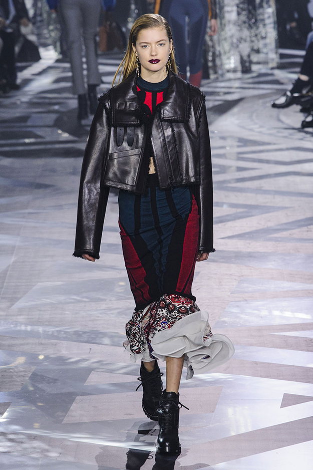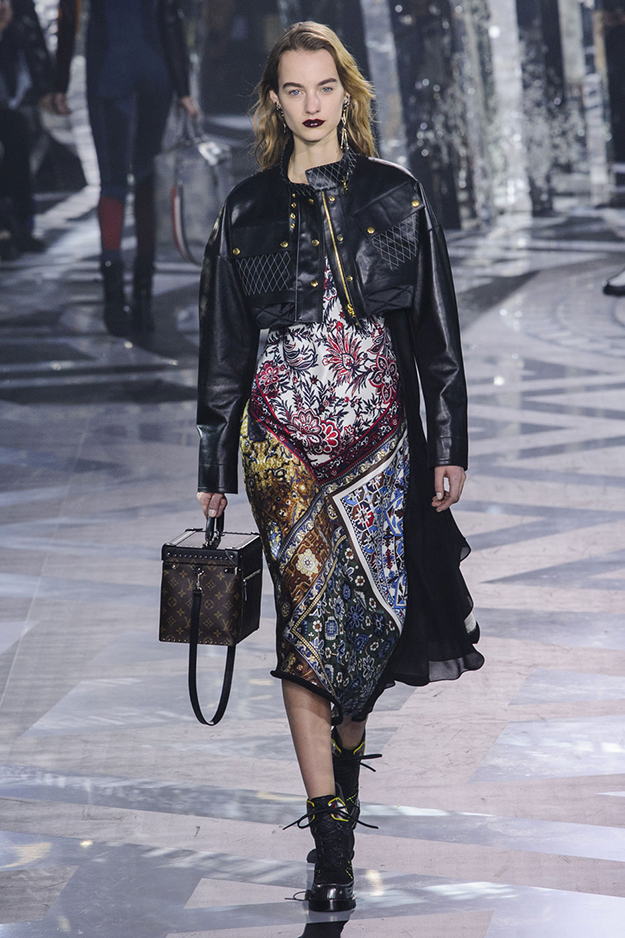 Укороченные косухи были на пике популярности пять лет назад, и вот, они снова вернулись. Для того чтобы избежать эффекта нулевых, укороченную мотокуртку лучше всего носить в паре с платьем миди — например, как у Louis Vuitton. В коллекции весна-лето 2017 Николя Гескьер показал сразу несколько вариантов укороченной байкерской куртки в сочетании с платьем средней длины с цветочным и этническим принтом. Для вечернего и более гламурного образа такую куртку можно носить с шелковым платьем в пол, как на весеннем показе Lanvin.