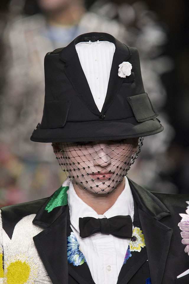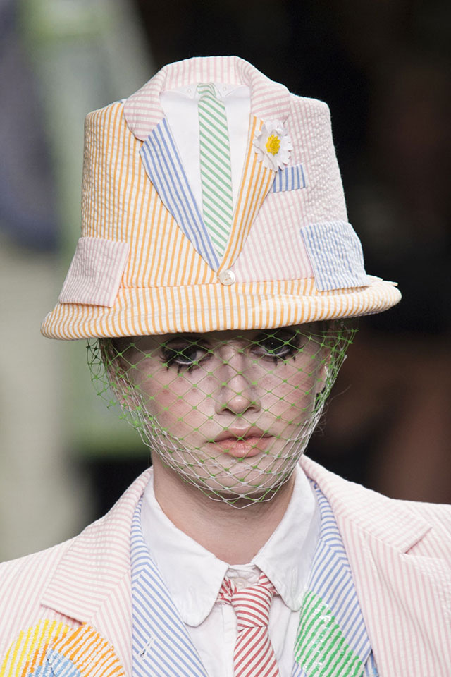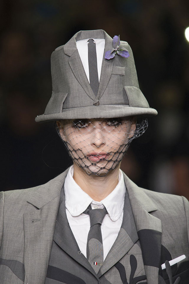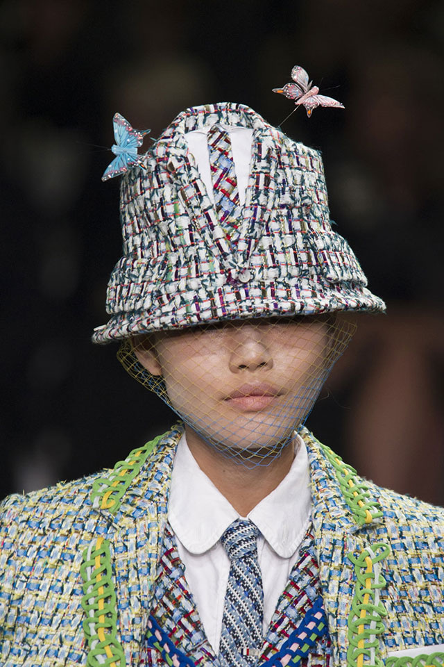 Шляпы для показа Thom Browne создал один из самых знаменитых шляпников мира моды — Стивен Джонс. Всего для шоу в его мастерской придумали 30 разных моделей, отталкиваясь от одной-единственной идеи тюрбана.