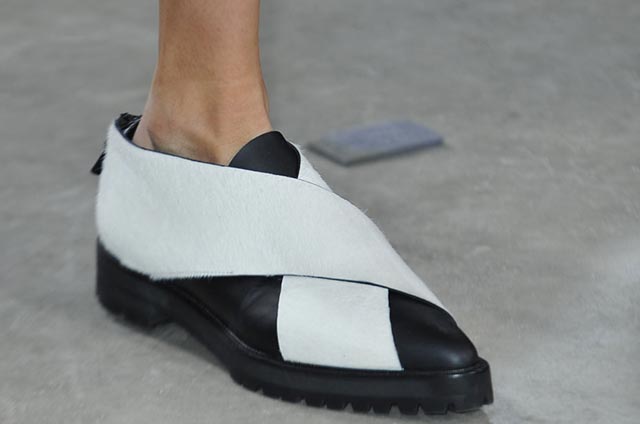 Самыми крутыми ботинками Нью-Йоркской недели моды мы торжественно объявляем эти черно-белые криперы Proenza Schouler. Если вы думаете, что черно-белые графичные сочетания остались в прошлом после прошлогоднего весенне-летнего сезона и повального увлечения дизайнеров поп-артом, это не так: графика и геометрия снова возвращаются на подиумы.