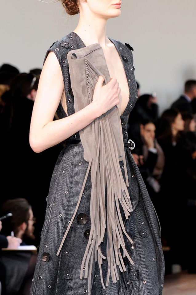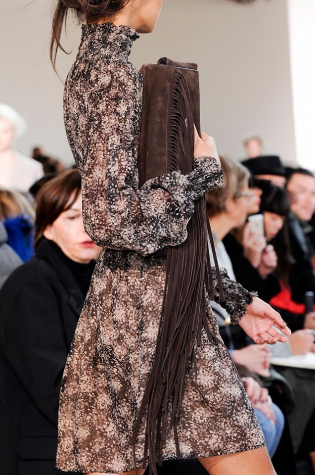 Обилие бахромы стало одной из самых заметных тенденций будущей осени, и аксессуары, конечно, вездесущая бахрома тоже не обошла стороной. Такие сумки были и на показе Michael Kors, и у Стюарта Виверса в его первой коллекции для Coach, и у Ralph Lauren. Нам больше всего понравился вариант, предложенный Майклом Корсом, — сумки-мешки с бахромой мы уже видели, со стилем boho-chic хорошо знакомы, а вот такие "хвостатые" клатчи выглядят свежо и непривычно. Крупные сумки Michael Kors с тем же мотивом тоже очень хороши — особенно потому, что меньше всего ассоциаций вызывают со стилем хиппи.