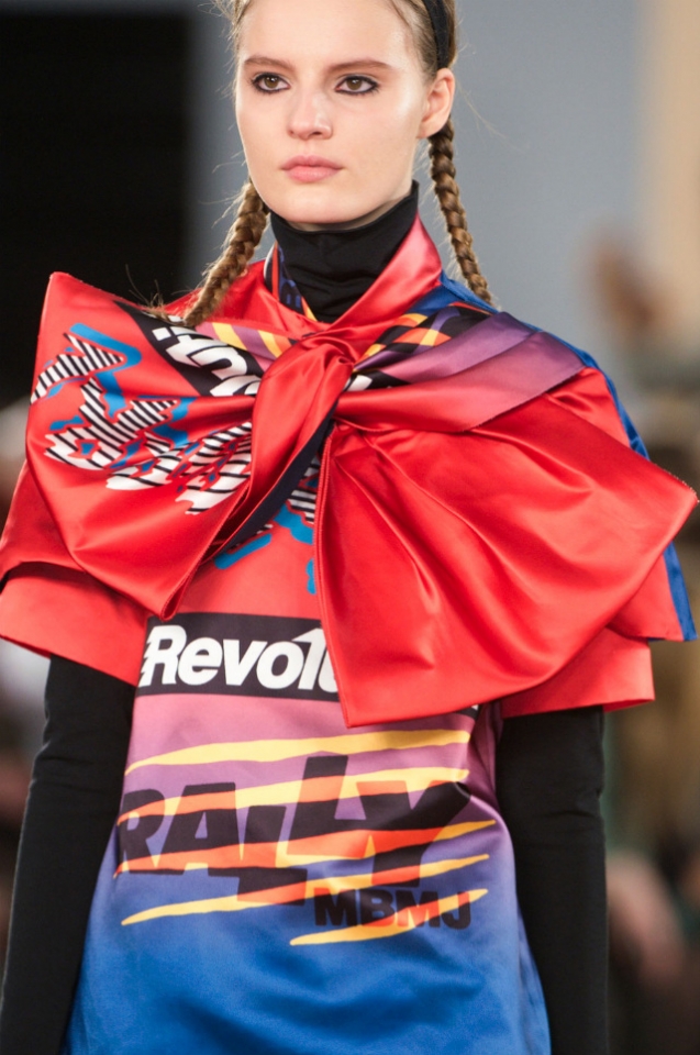 Всю коллекцию, созданную Кэти Хиллиер и Луэллой Бартли, можно разобрать на цитаты — по крайней мере, когда дело касается аксессуаров. Во-первых, пышные банты на шеях — самая необычная и девичья вариация Огромного Шарфа, который следующей зимой придется завести каждому. Во-вторых, безумные кроссовки на высокой подошве и гольфы, идущие с ними в паре. В-третьих, обладающие по-настоящему гипнотическим эффектом сумки.