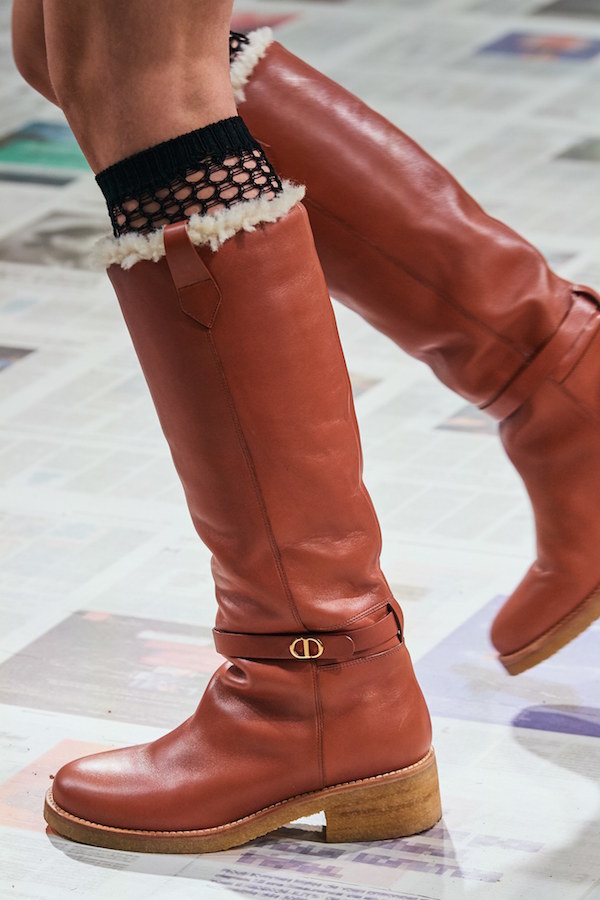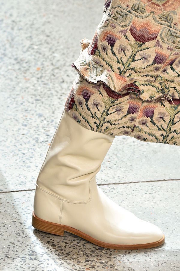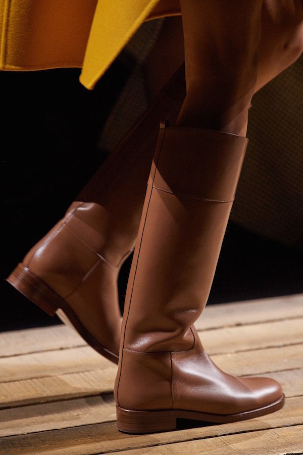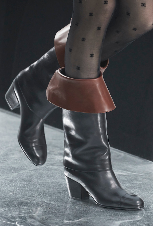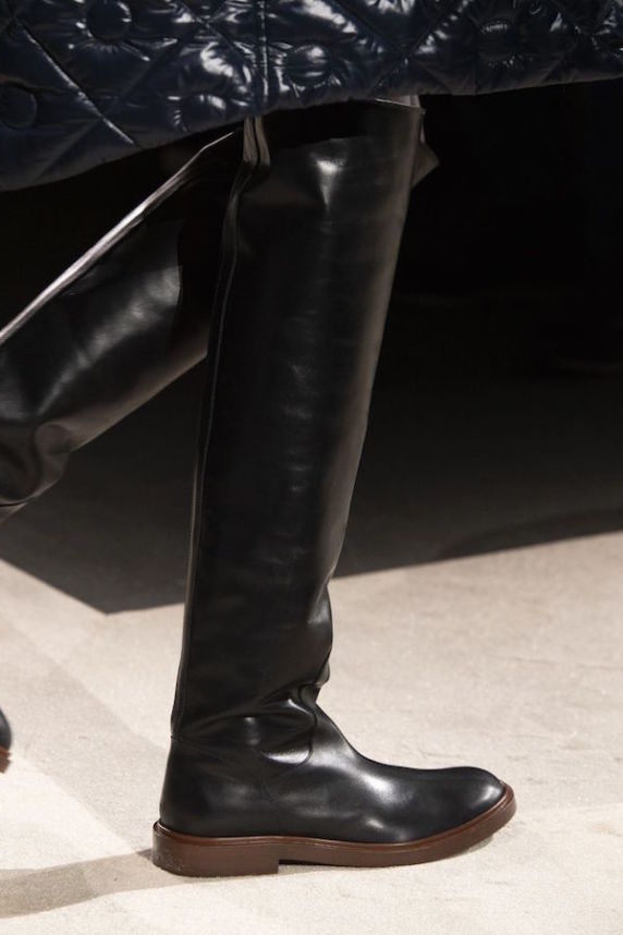 Креативный директор Chanel вспоминает снимок Карла Лагерфельда и Анны Пьяджи 1978 года, на котором дизайнер одет в полосатый костюм и жокейские сапоги с отворотами. Точно такие же вошли в новую коллекцию модного дома. Другие вариации на основе сапог для верховой езды есть у Salvatore Ferragamo, Dior и Tod’s.