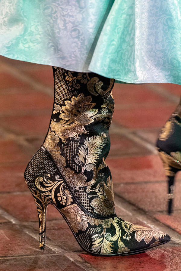 Новая нарядность — это сливаться со старинными интерьерами: обивочным бархатом, гобеленами или обоями художника-прерафаэлита Уильяма Морриса. Высший уровень — носить такие вещи с ног до головы. К слову, платьев и костюмов, словно из обивочных материалов, в новых коллекциях тоже предостаточно.