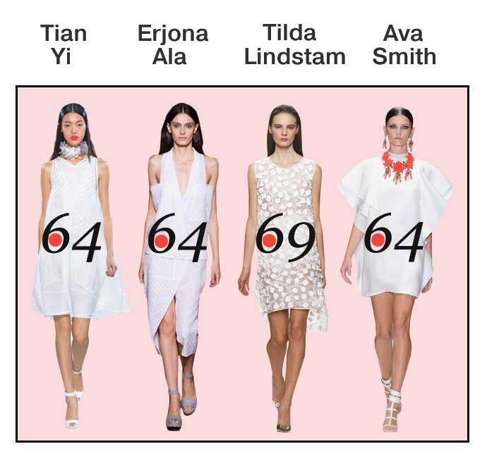 И, наконец, абсолютной рекордсменкой в этом сезоне стала модель Тильда Линдстем, на счету которой 69 показов. Следом за ней идут Тян Ю, Ава Смит и Эржон Ала, которые в этот раз появились на подиуме по 64 раза.