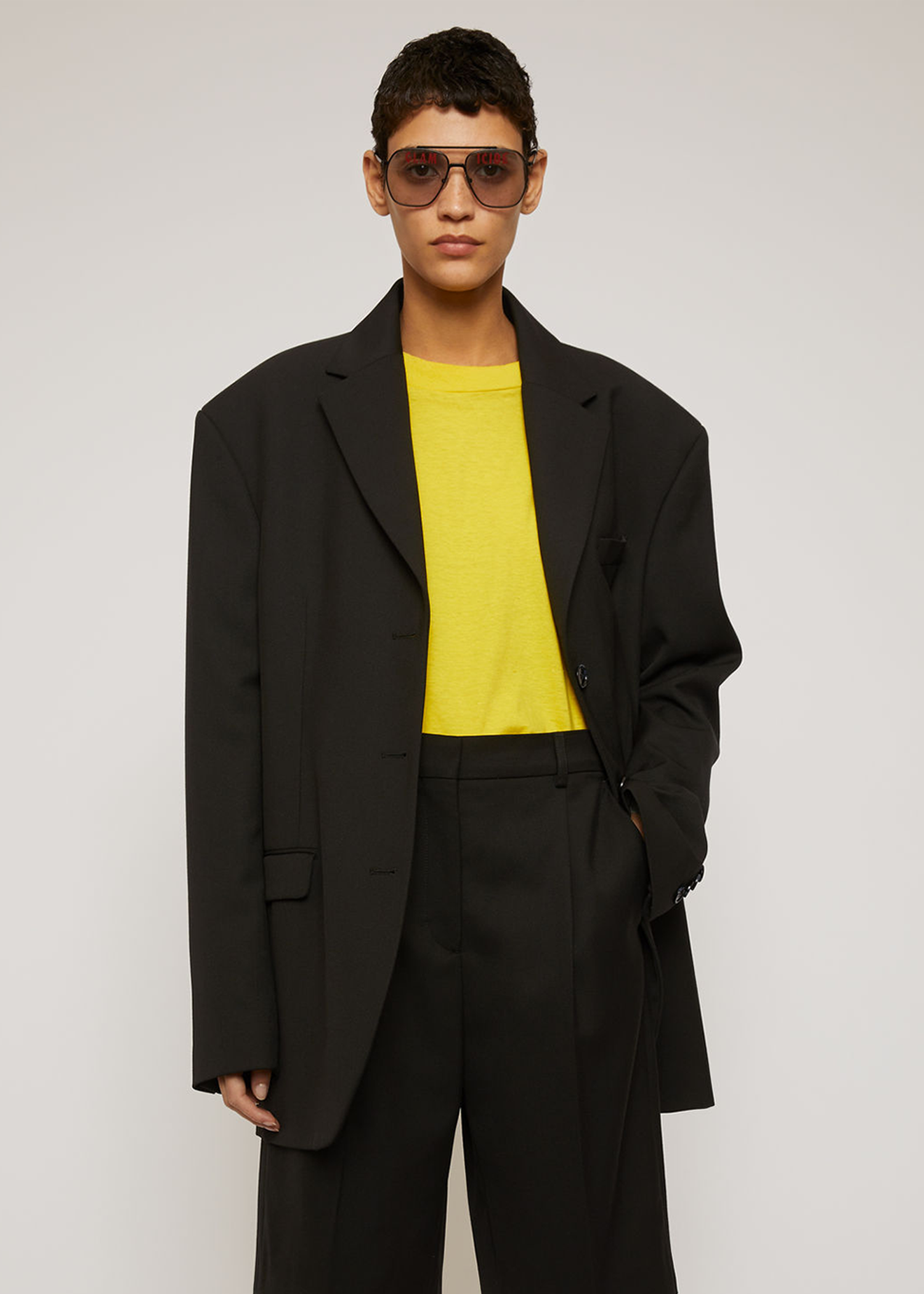 Костюм с удлиненными шортами — одна из самых актуальных вещей этого сезона. В данном образе он дополнен базовым свитером из кашемира, акцентными сапогами и сумкой архитектурной формы. Костюм задает направление образа, но за счет цвета является отличным фоном, на котором играют аксессуары.