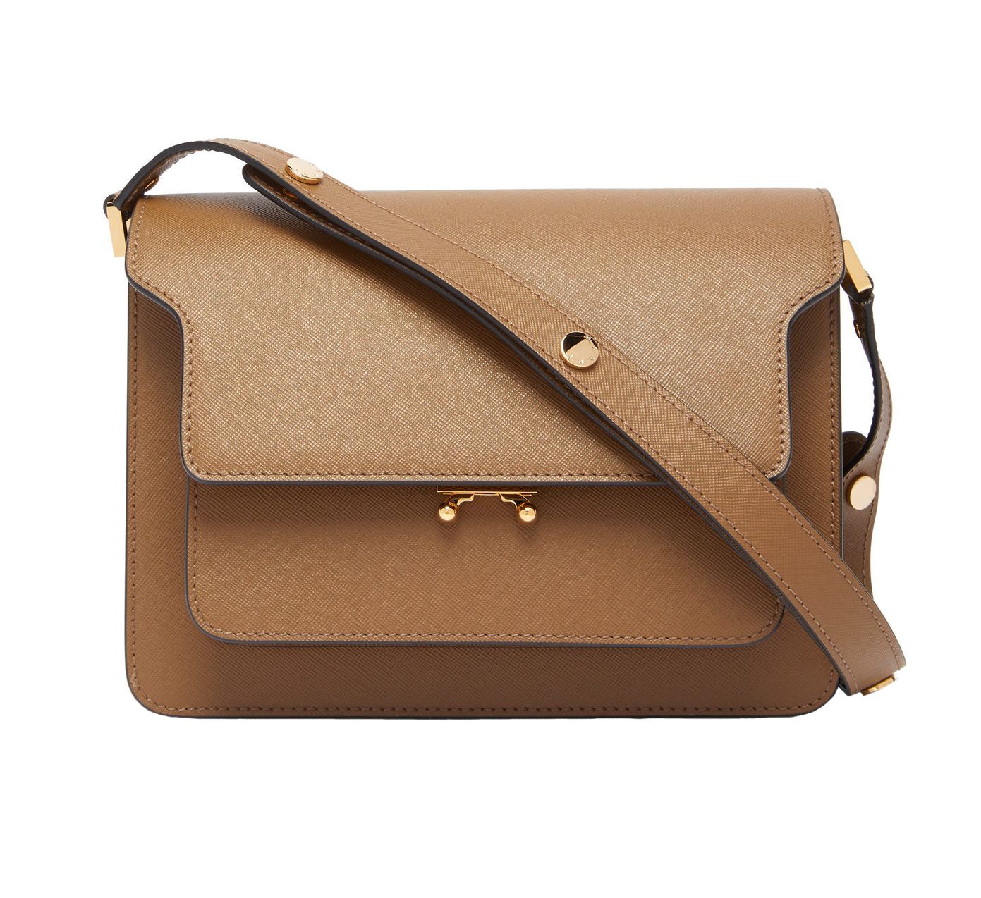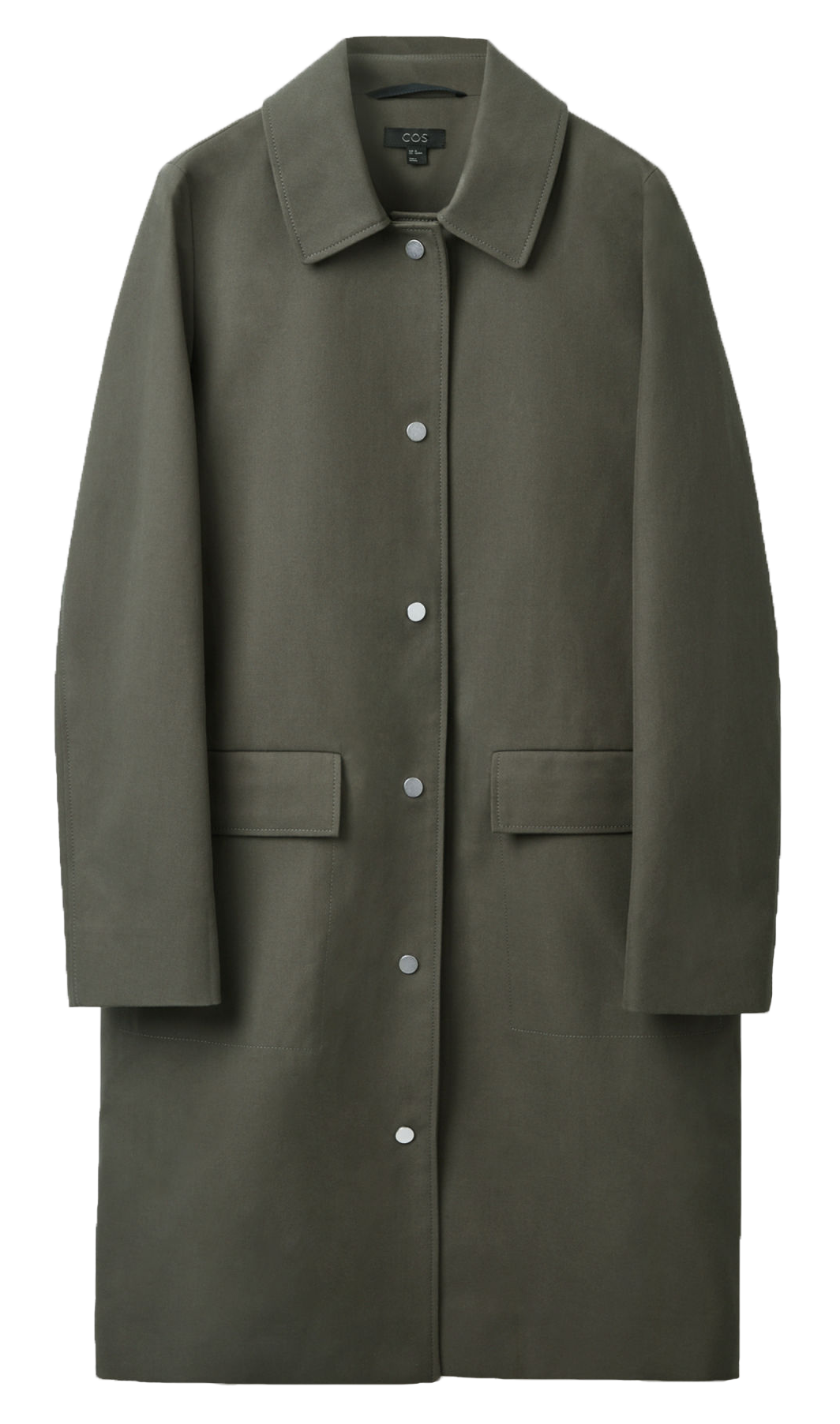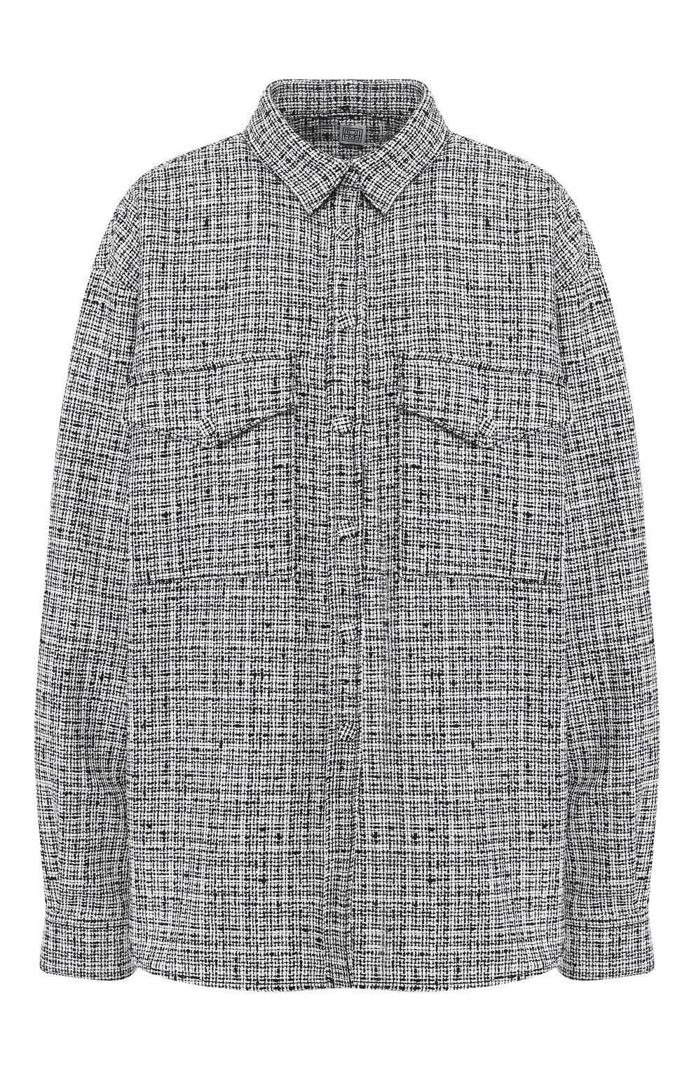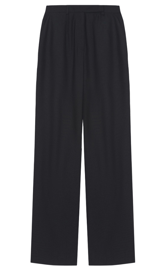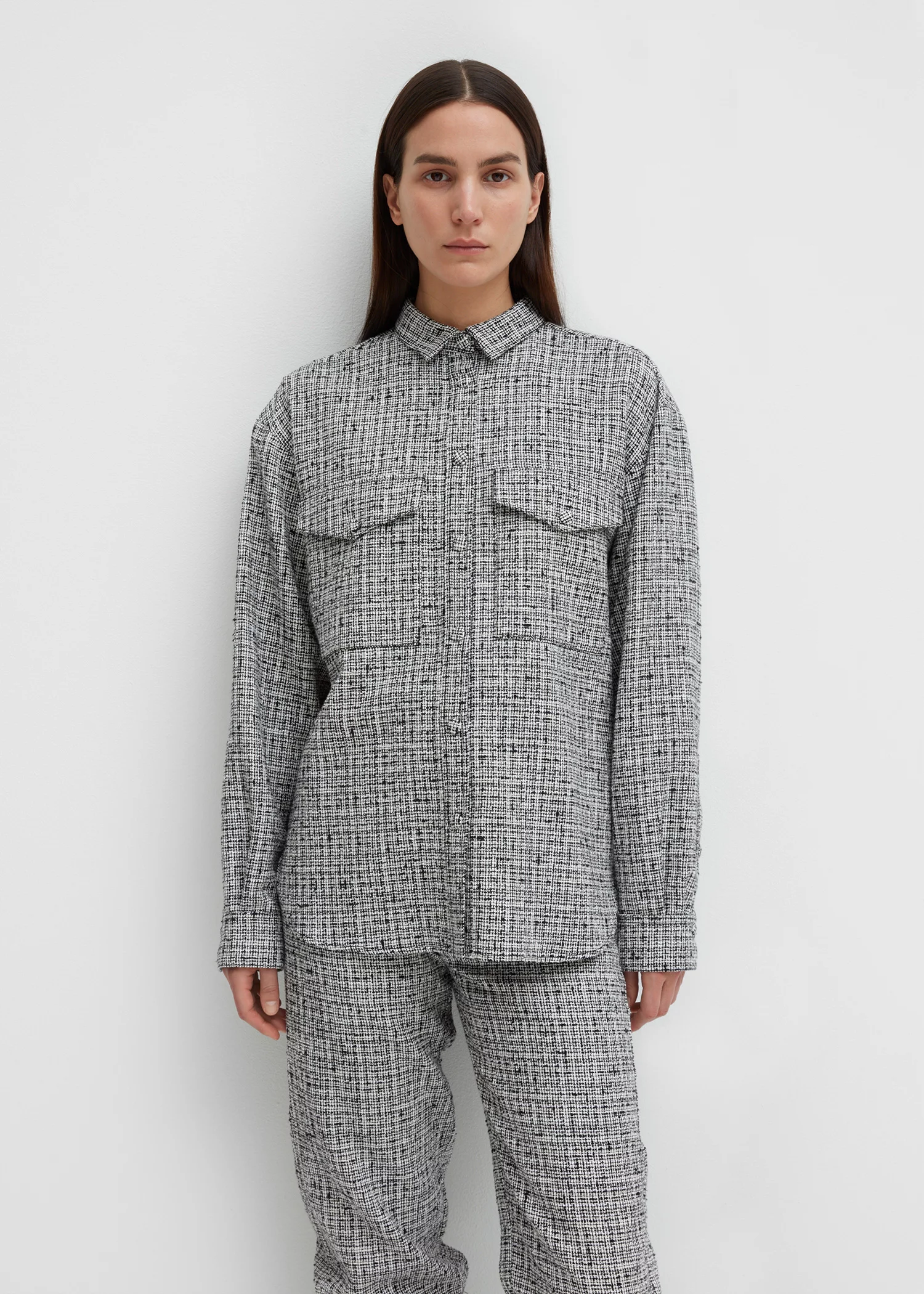 Современное прочтение костюма — брюки дополнены верхней рубашкой, а не жакетом, что делает образ не таким строгим. Пальто из хлопка и сумка жесткой формы подтягивают образ и формируют силуэт.