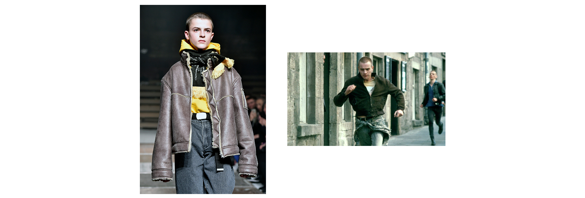 Замшевый бомбер, олимпийки и buzzcut (стрижка под 0,5 см) Рентона навевают стиль футбольных фанатов и габберов. В то время как пероксидный блонд, неоновые оранжевые топы Саймона и очки Кочерыжки выглядят как повседневная униформа для рейвов. Рентон, Бегби, Саймон и Кочерыжка существуют как раз в этой среде нигилистов-бездельников из среднего класса, которые, как это характерно для стыка эпох, были потерянным поколением. Более того, по итогам второй части фильма они им и остались. Однако именно это поколение создало культуру и стиль 90-х, которые были так несовершенны в своем совершенстве. Уже сейчас, в 2017 году, мода на 90-е продолжает оставаться в общественном бессознательном — во многом потому, что у руля индустрии находятся люди, которые выросли в то время и пропустили его через себя. Об этой эпохе все еще будет рассказывать журнал Dazed, который именно тогда зародился в маленькой лондонской квартире этажом ниже Кейт Мосс. Дизайнеры Раф Симонс, Николя Жескьер и Марк Джейкобс из коллекции в коллекцию в лучших традициях десятилетия будут смешивать моду и культуру, а вечно молодое наследие Александра Маккуина будет вдохновлять еще не одного молодого дизайнера.