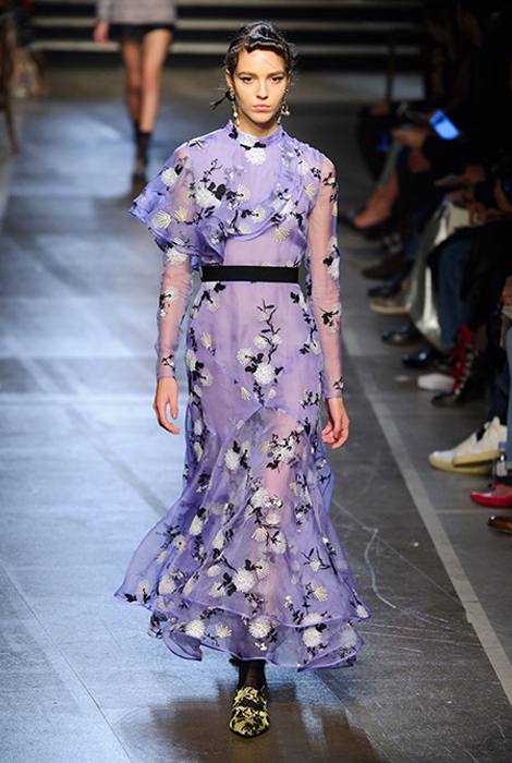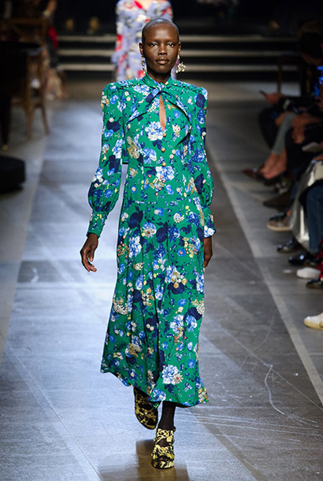 Коллекции Erdem — яркий пример того, как цветочный принт и вышивка могут переходить из одной коллекции в другую и при этом оставаться свежими и новаторскими. В этом весенне-летнем сезоне Эрдем Моралиоглу представил пестрые весенние платья, сплошь усыпанные миниатюрными цветами, — например зеленое платье с принтом сирени.