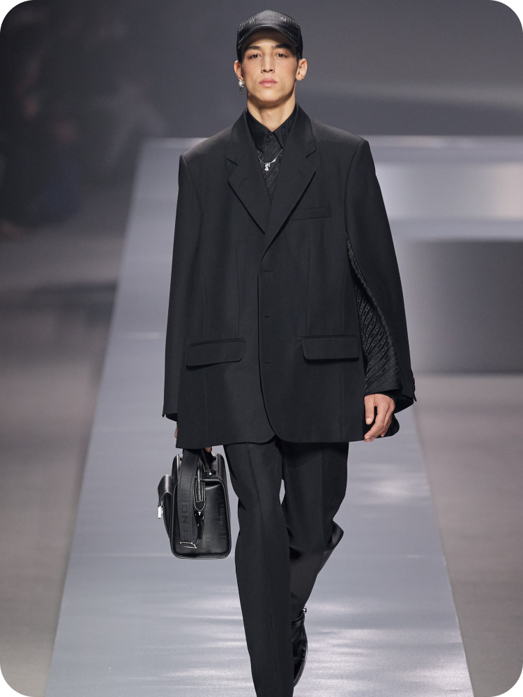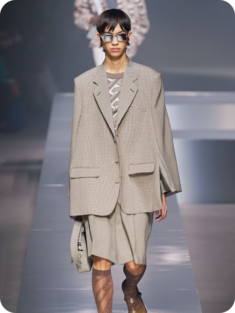 Сильвия Вентурини Фенди тоже рефлексирует на тему мужского костюма для новой реальности. В коллекции есть гибрид пиджака и кейпа: благодаря разрезам на рукавах формальная вещь дает свободу движения. Низ костюма Fendi также трансформировался — до брюк с разрезами на щиколотках и бермудов.