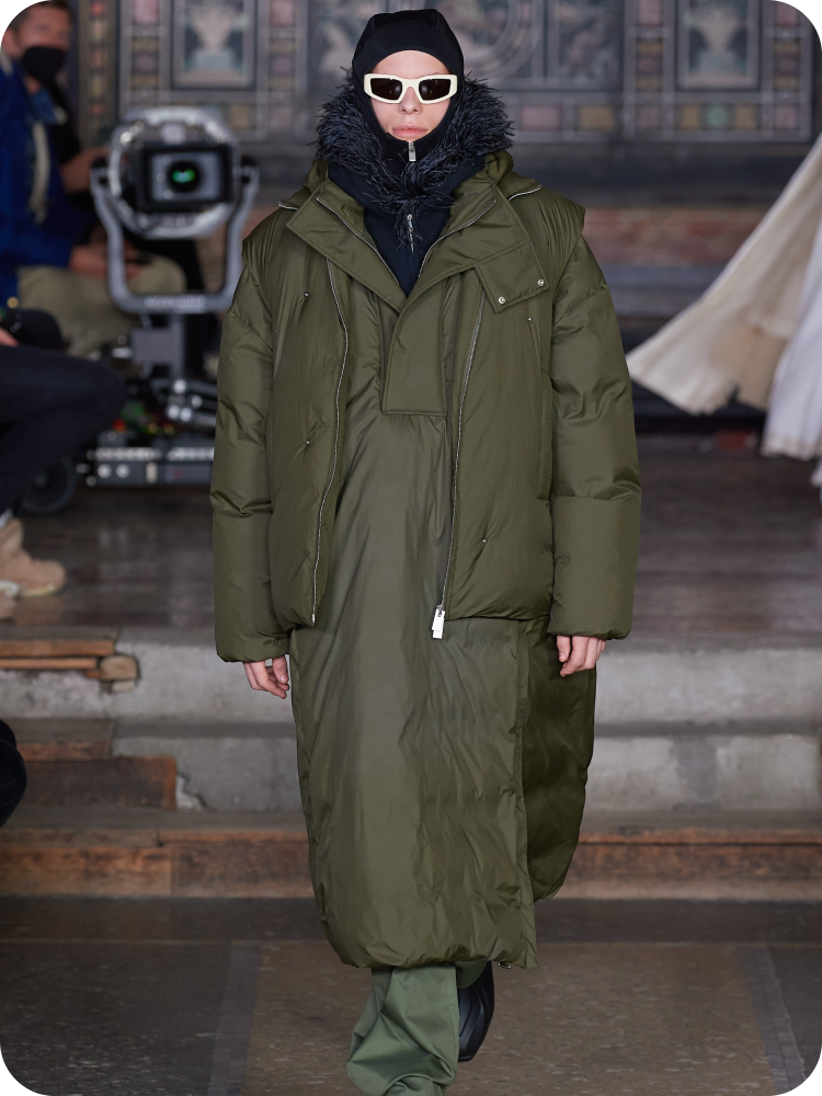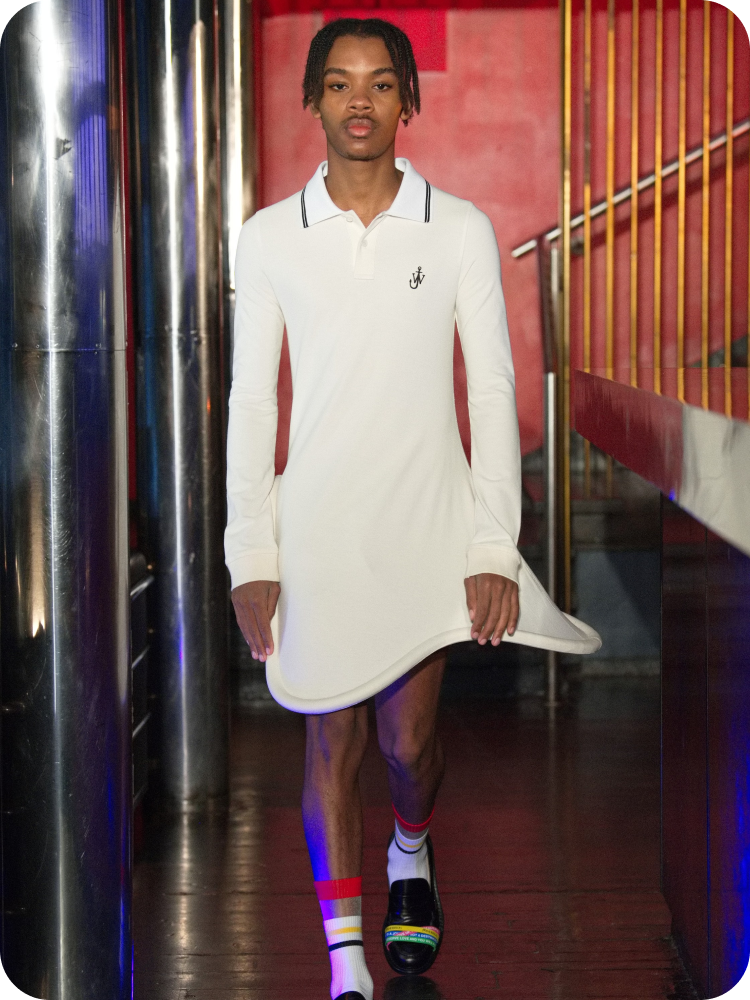 Джонатан Андерсон — виртуоз игры с объемами и силуэтами. Вещи из новой коллекции держат необычный объем благодаря вшитым ободам по краям: мужские платья выглядят так, словно их слегка поднимает ветром. Ободы также есть в дубленках и пальто — несмотря на сложную конструкцию, выглядят эти вещи повседневно.