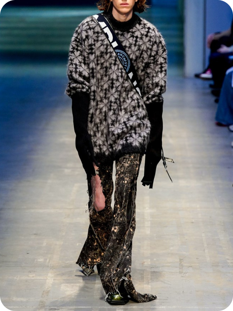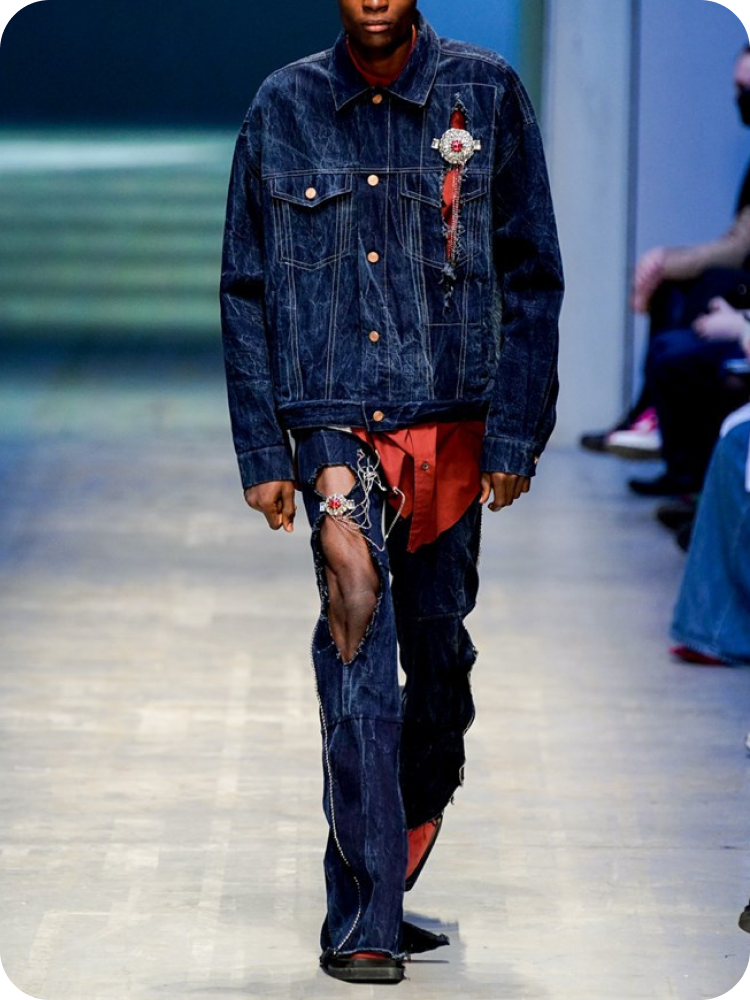Молодой дизайнерский дуэт уже показывался на Неделе моды в Лондоне, а в сезоне осень-зима 2022 дебютировал в Милане. За брендом стоят Джордан Боуэн и Лука Маркетто. Джордан учился на миллинера и работал у Стивена Джонса, а Лука семь лет трудился в Vivienne Westwood личным ассистентом самой Вествуд. Их новая коллекция полна энергии и необычных идей: удлиненные кожаные куртки, мохеровые костюмы с брюками клеш, шарфы с бутоном и шипами. Особенно эффектными получились рваные джинсы, декорированные множеством цепочек и брошами с псевдорубинами.