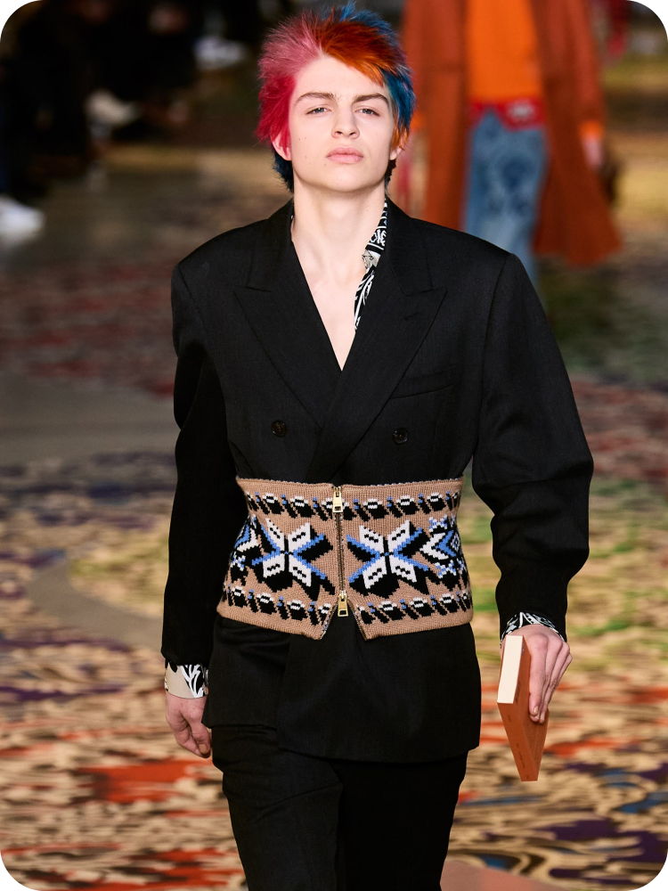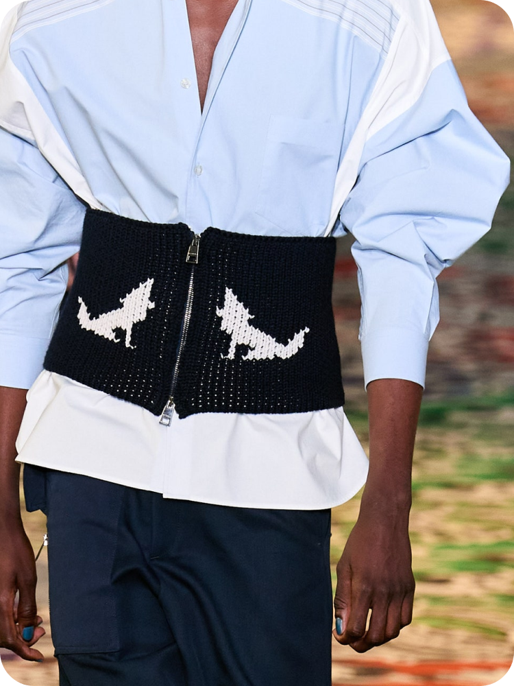 Еще чуть-чуть, и мода легитимизирует пояс из собачьей шерсти. Если без шуток, то в коллекции Кина Этро мы увидели похожий функциональный аксессуар — широкий вязаный пояс на молнии, который на показе носили поверх рубашек, свитеров и пиджаков. Есть варианты в тон костюма, которые из-за сходства цветов почти незаметны, и, наоборот, контрастные с орнаментом. Теперь ждем похожую вещь в женских коллекциях.