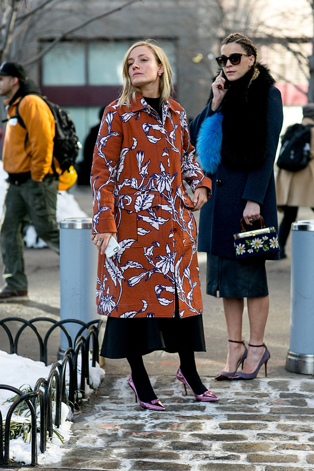 Никакие холода не остановят уверенный ход недели моды: в Нью-Йорке вчера завершился седьмой день показов в режиме нон-стоп. Гости, привычные и не к таким ритмам, выглядят свежими, счастливыми и довольно расслабленными. Высокие каблуки вновь постепенно уступают место кроссовкам (пользуясь случаем, напоминаем о том, что мы даже не так давно составляли гид о том, как носить эту обувь зимой), ну а кое-кто по-прежнему не изменяет любимым босоножкам, надетым с белыми носочками. Кричаще пестрых нарядов и просто ярких красок на улицах Нью-Йорка в этот день было мало, а нежно-розовое конфетное пальто и вовсе всего одно.