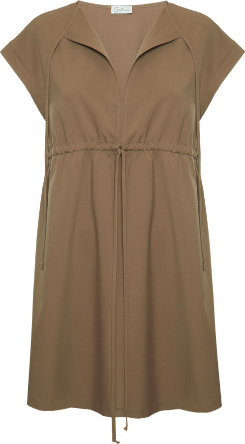 Платье свободного кроя в теннисном стиле дополнено комфортными босоножками на толстом каблуке и объемной сумкой в тон. Белая обувь оживляет образ и делает его более ярким, а серьги с черной эмалью перекликаются по цвету с ручками сумки.