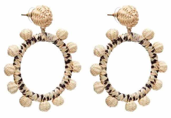 Вместительная сумка-мешок смотрится женственно за счет узелков, поэтому она идеально вписывается в образ с романтичным топом в клетку виши и прямыми джинсами. Серьги из пальмового волокна завершают образ, поддерживая замшевые мюли и топ по цвету.
