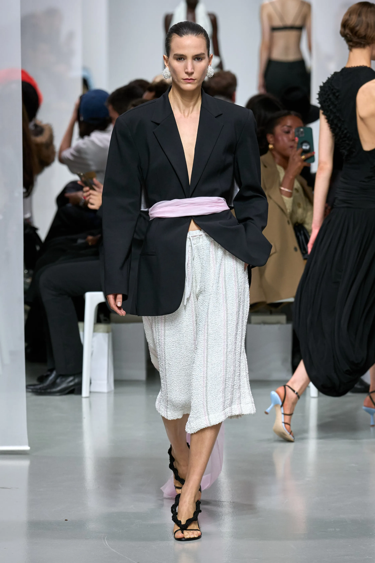 Носите плечистые жакеты с купальником, «банной» юбкой и асимметричным топом.