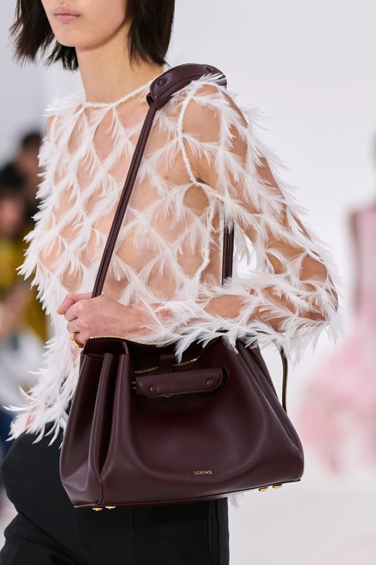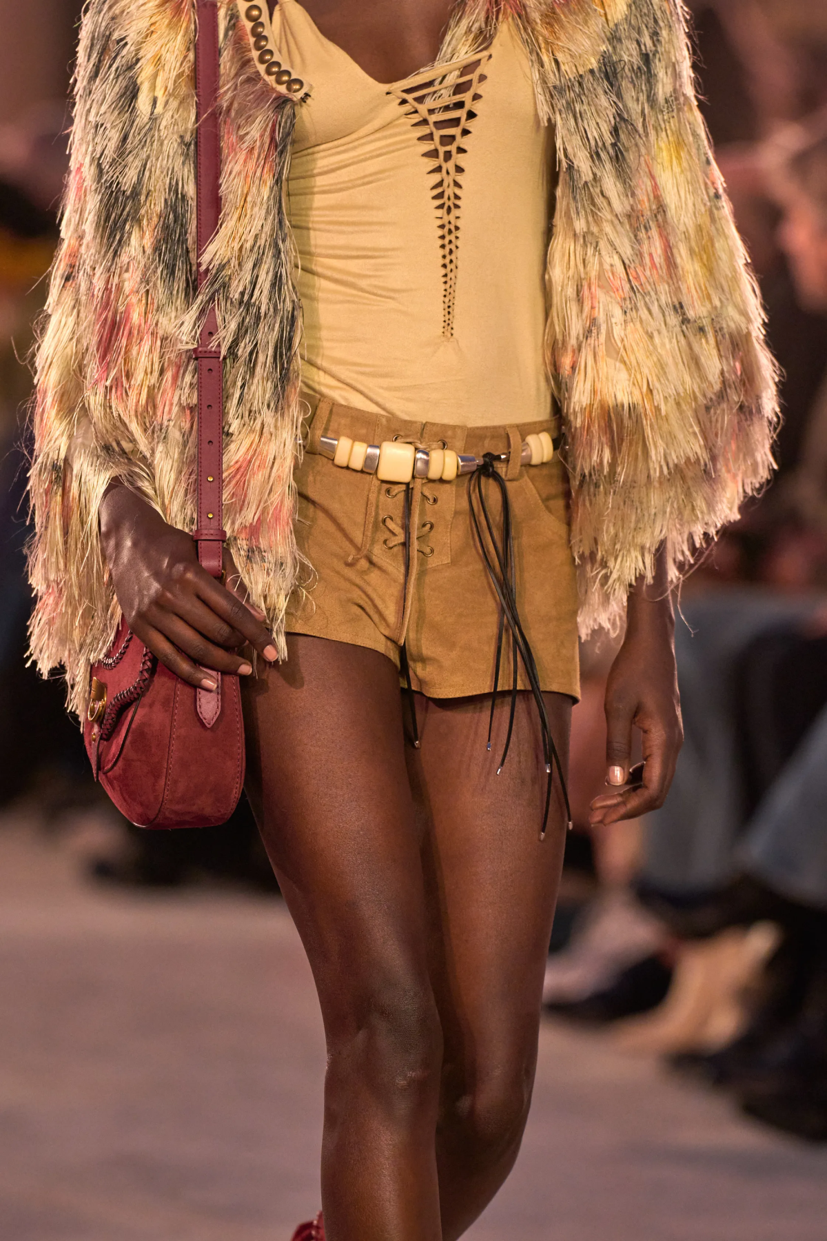 Если бахрома замшевая, то на куртках; если перьев много, то везде.