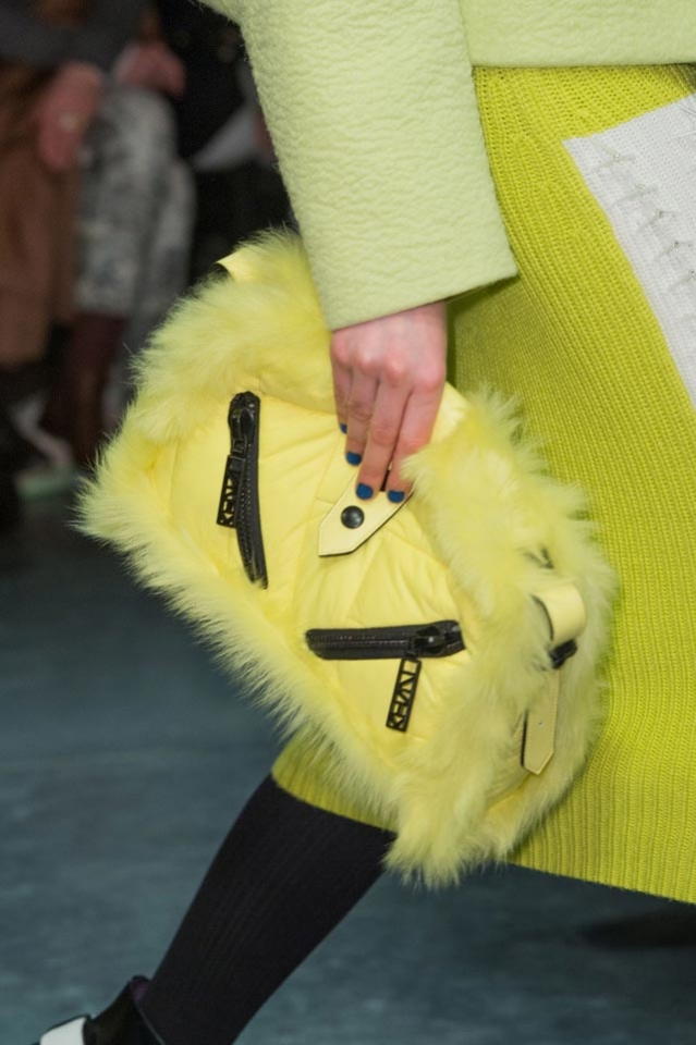Неожиданный дуэт очень в духе французской марки: маленькая сумочка, трогательно прижатая к груди и похожая на косметичку, и нарукавник из пушистого меха, до муфты не дотягивающий размером. Все формата мини, немного кукольное и совершенно очаровательное.