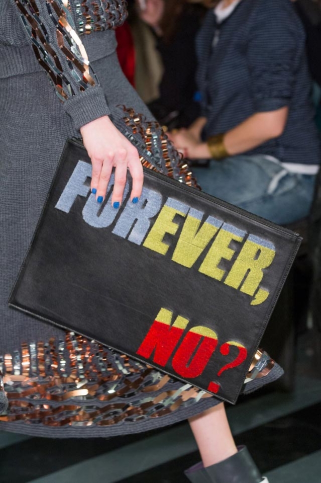 Кстати, о сумках-заявлениях: клатчи Kenzo оказались самыми искренними — трогательное и загадочное Forever, No? расшифровывать можно по-разному, в зависимости от минутного настроения, но в груди в любом случае что-то да дрогнет.