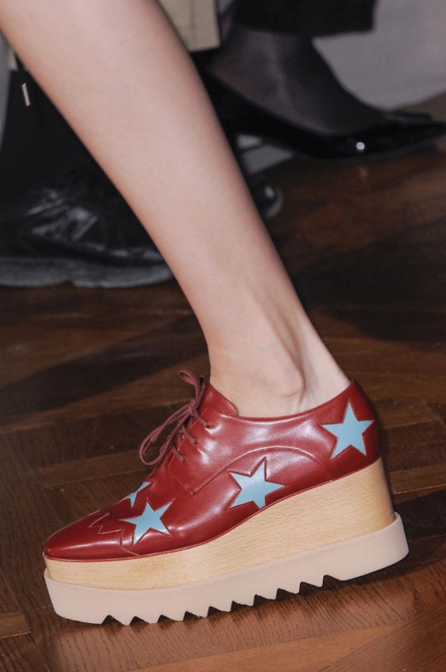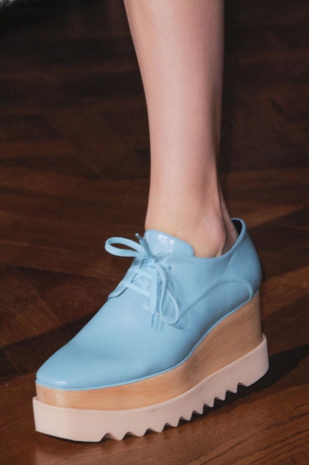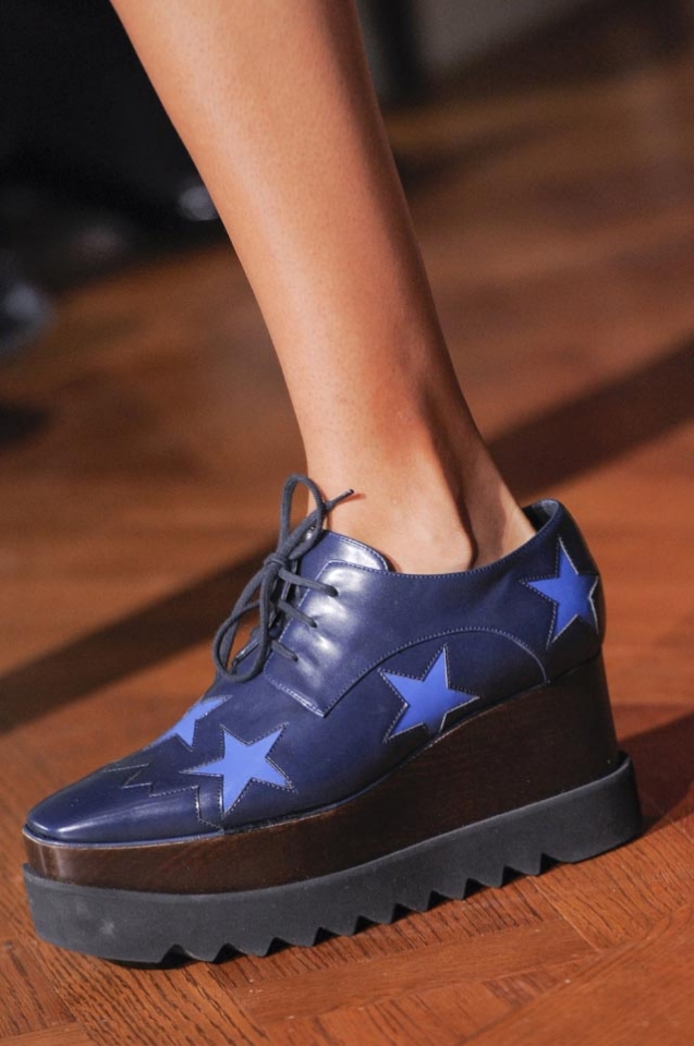 Сапоги до колена на широком квадратном каблуке прямиком из шестидесятых, кукольные туфельки "Мэри Джейн" с перепонками, а иногда даже с помпонами на носочках — и, главное, много блеска и глиттера, чтобы не дать зрителям заскучать.