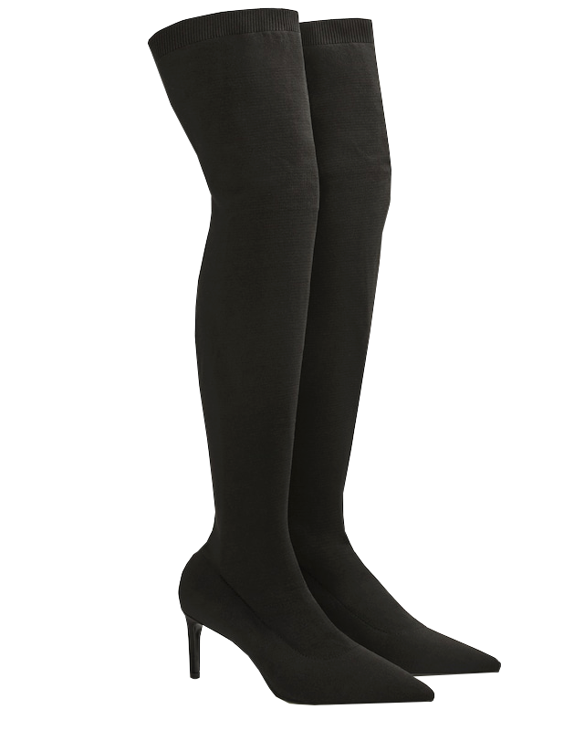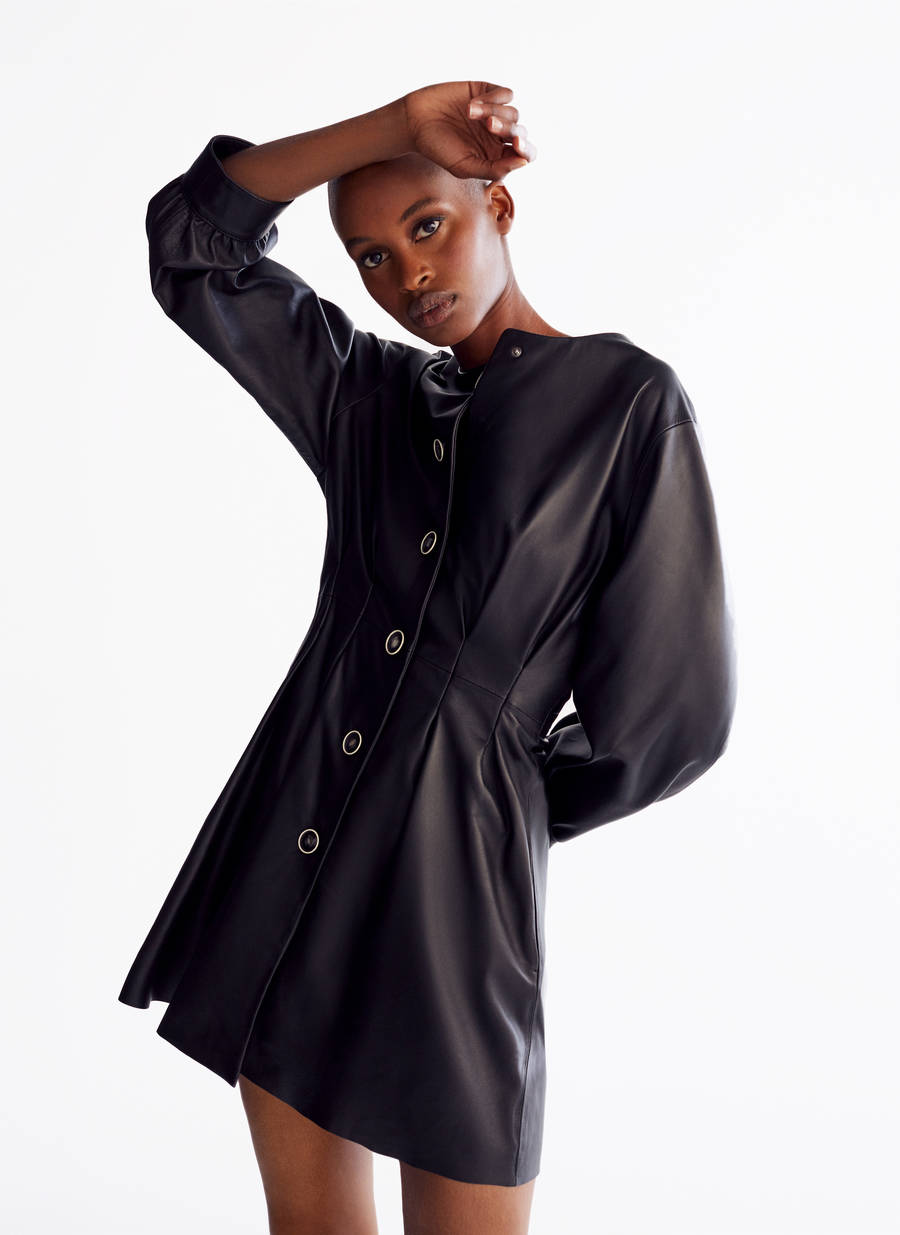 Кожаное платье длины мини — самодостаточная вещь, которая не требует дополнительных акцентов. В данном образе платье дополнено сапогами из эластичной кожи и сумкой простой формы.