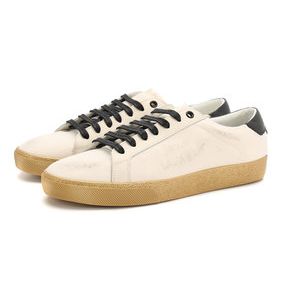 Кожаные брюки дополнены свитером с искусственными потертостями, который идеально перекликается с кедами по цветам.