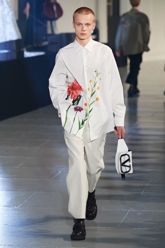 Мы уже рассказывали, что коллекции сезона осень-зима 2020 чествовали новую мужественность. Gucci представил манифест против токсичной маскулинности, Джонатан Андерсон — мужские платья, Стефано Пилати одел парней в сапоги-чулки и мерцающие бра. Пьерпаоло Пиччоли тоже борется с токсичной маскулинностью — по-своему мягко и нежно. Белоснежные рубашки и лаконичные плащи в новой коллекции Valentino преобразились пионами и гвоздиками — цветочные фотопринты сделаны на основе работ фэшн-фотографов Инеза ван Ламсвеерде и Винуд Матадин.